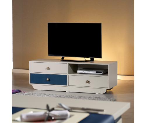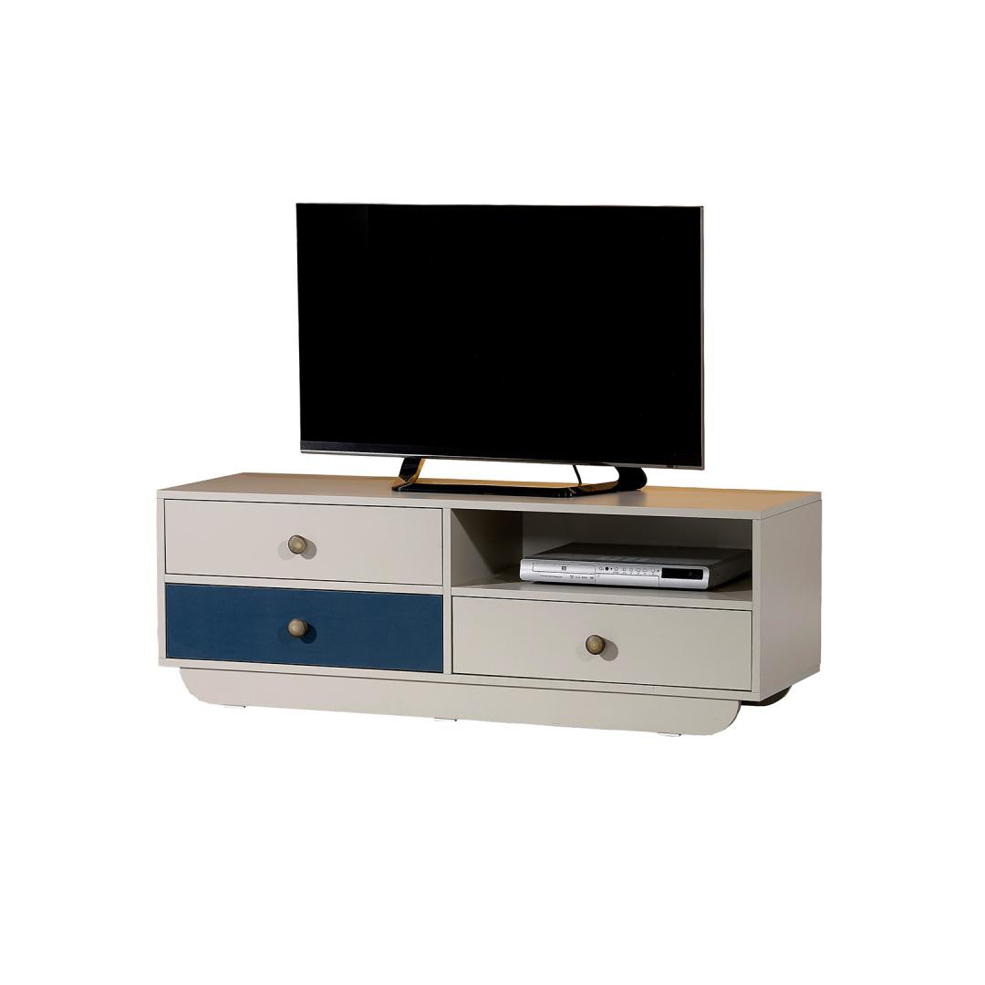 Not only does our TV stand offer a stylish and modern look, but it also provides ample storage space for all your media essentials. With a width of 140cm, height of 48cm, and depth of 41cm, it offers plenty of room for your TV, gaming consoles, and other entertainment devices. The white and blue color combination adds a pop of color to your living room, creating a vibrant and inviting atmosphere.