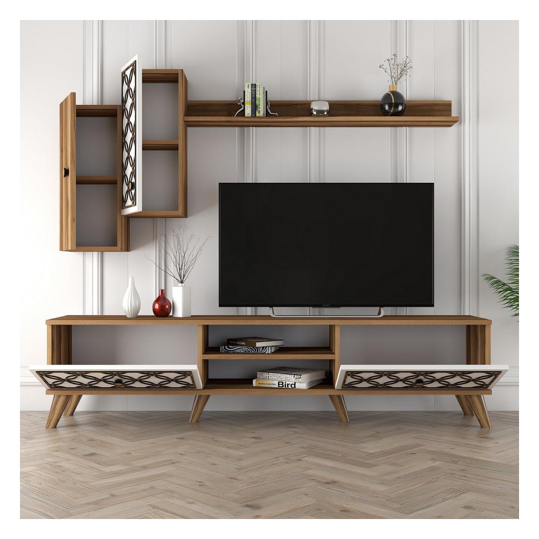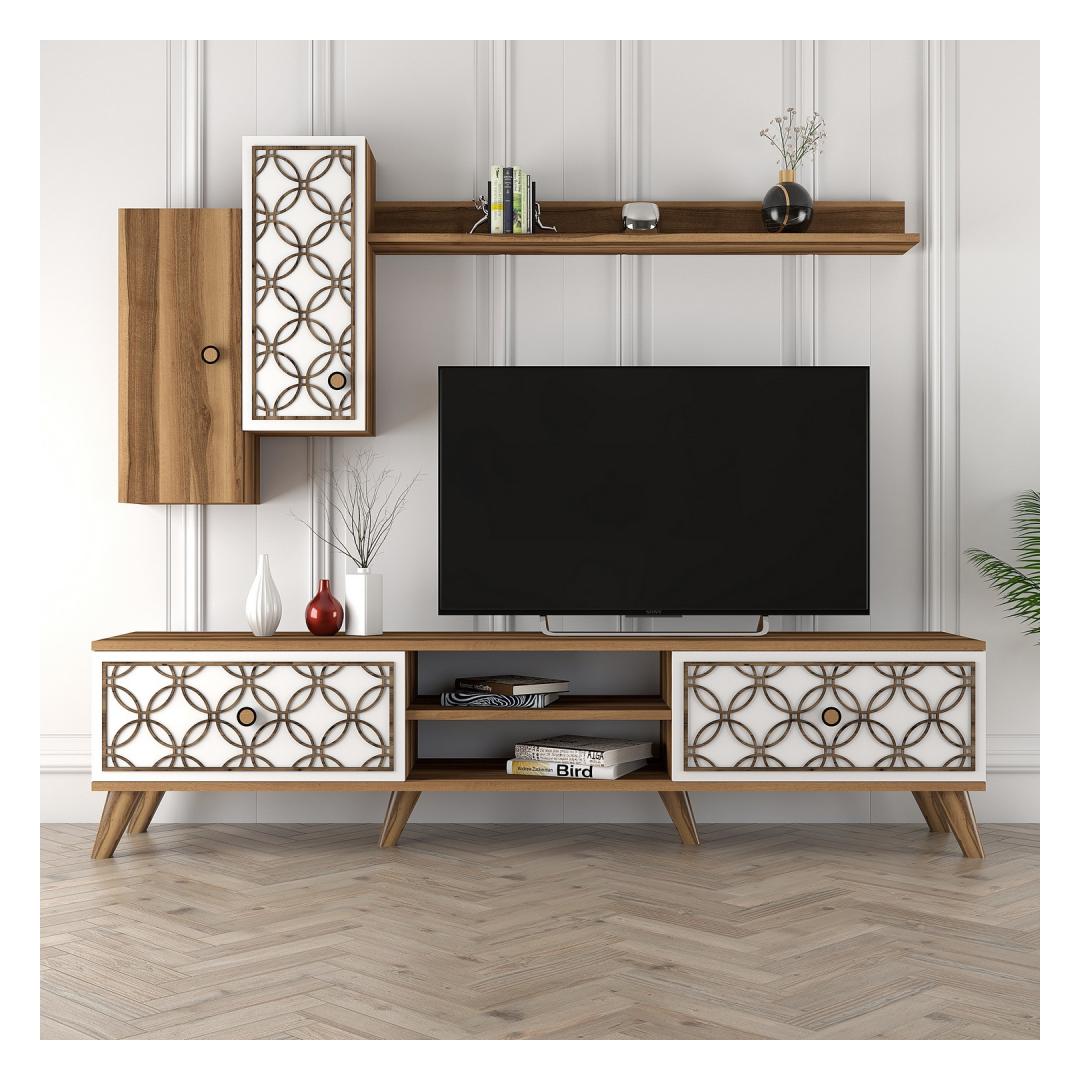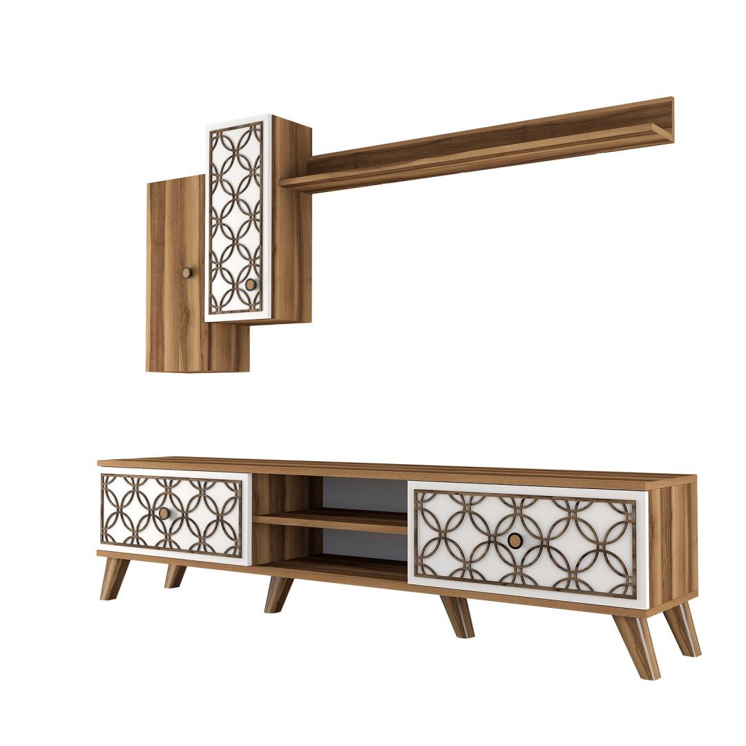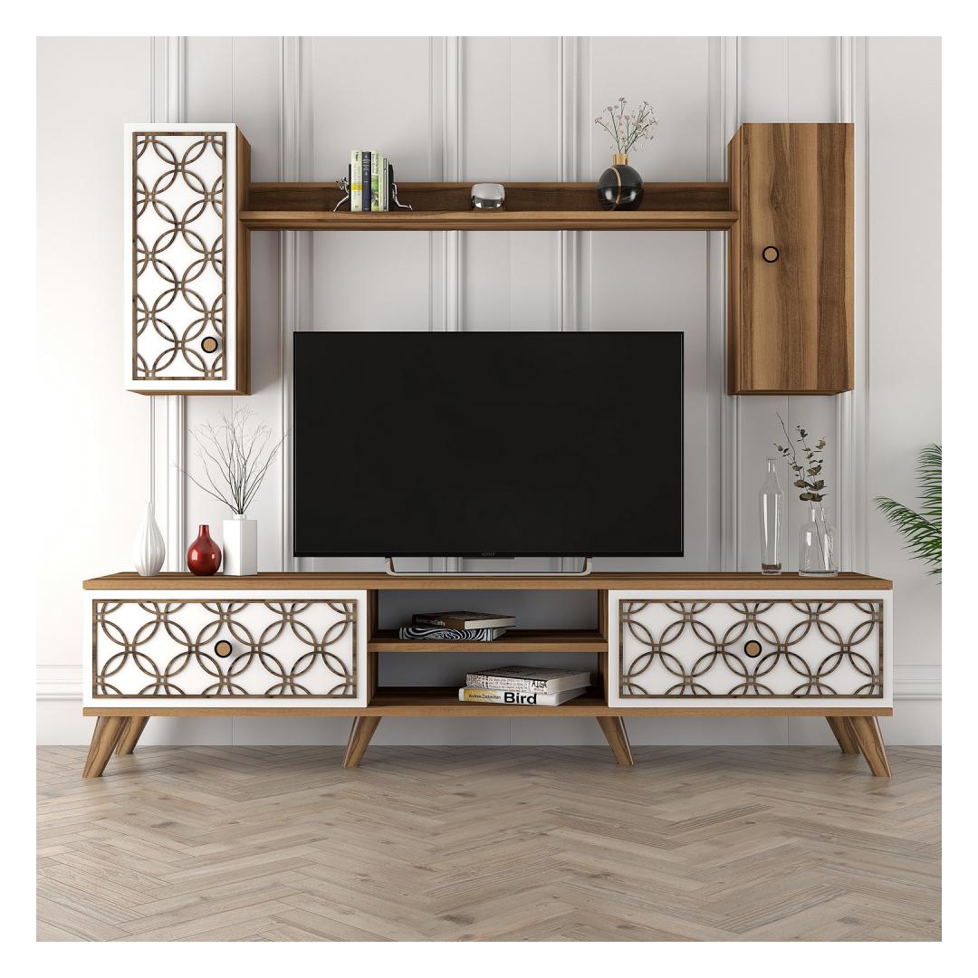 Muuda oma elutuba stiilseks ja funktsionaalseks ruumiks meie suurepärase telerikapi abil. Valmistatud 100% melamiinkattega puitlaastplaadist, on see kapp mitte ainult vastupidav, vaid lisab ka elegantsi teie kodu sisustusele.Tõsta oma eluruumiLihtsa disaini ja modernse kontseptsiooniga on see telerikapp ideaalne täiendus igasse koju. 4 mm CNC-reljeef lisab ainulaadse puudutuse, samas kui plastjalad tagavad stabiilsuse ja toe. Kapp sisaldab seinale paigaldatavat riiulit ja kappe, mis pakuvad piisavalt hoiuruumi, muutes selle ideaalseks meelelahutuse tarvikute organiseerimiseks.Vabasta oma loovusPähklipuu ja valge värvikombinatsioon lisab teie elutuppa kaasaegset hõngu, samas kui arvukad riiulid võimaldavad teil eksponeerida oma lemmik sisustuselemente. Telerikappi saab ka seina külge kinnitada, et tagada lisaturvalisus, andes teile meelerahu.Tehnilised andmed:Materjal: 100% melamiinkattega puitlaastplaatPaksus: 18 mm4 mm CNC-reljeefPlastjalad stabiilsuse tagamiseksTelerikapi suurus: Laius: 180 cm, Kõrgus: 44 cm, Sügavus: 35 cmSeinariiuli suurus: Laius: 120 cm, Kõrgus: 14.2 cm, Sügavus: 13.6 cmKapi suurus: Laius: 26.5 cm, Kõrgus: 63 cm, Sügavus: 21.8 cm (2 tk)Värv: Pähklipuu ja valgeKontseptsioon: Kaasaegne - Uudsus, Ameerika traditsiooniline, Damask, LillUuenda oma eluruumi meie telerikapiga ja koge stiili ja funktsionaalsuse ideaalset segu. Ära jäta kasutamata võimalust muuta oma kodu mugavuse ja rafineerituse pelgupaigaks. Tellige oma juba täna! Värv: Walnut White