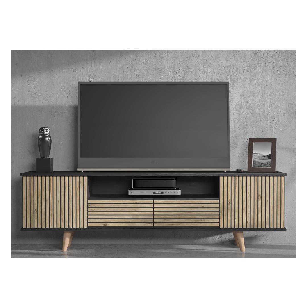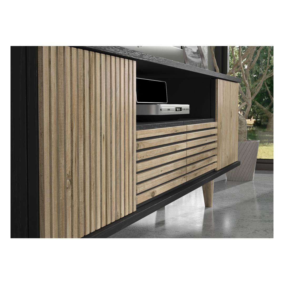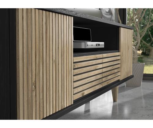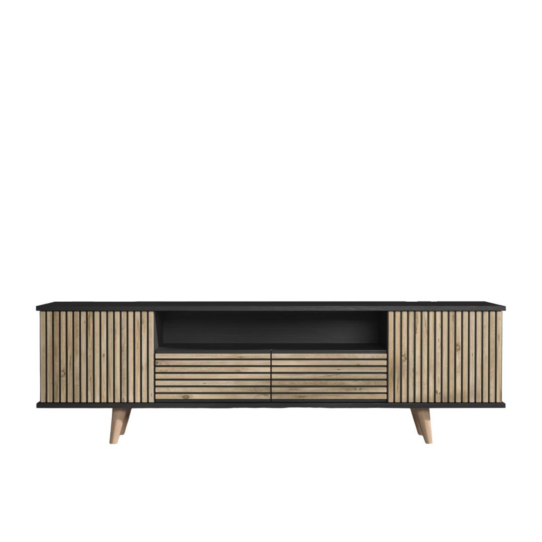 The TV stand features a beautiful blend of wooden, black, and Atlantic Pine colors, adding a touch of sophistication to any room. The clean lines and minimalist design make it a versatile addition to any decor style, from contemporary to traditional.