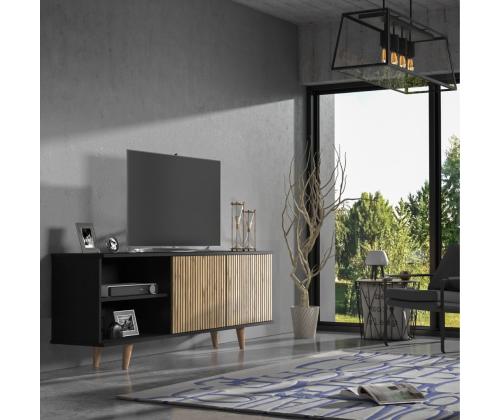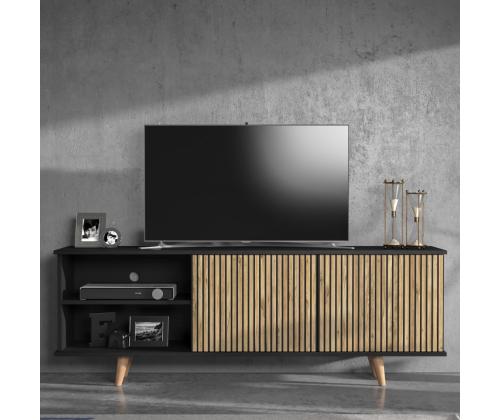 Transform your living room with our stunning TV stand, crafted from 100% chipboard for durability and style. The sleek design features a mix of wooden and black and Atlantic Pine colors, adding a touch of elegance to any space.
