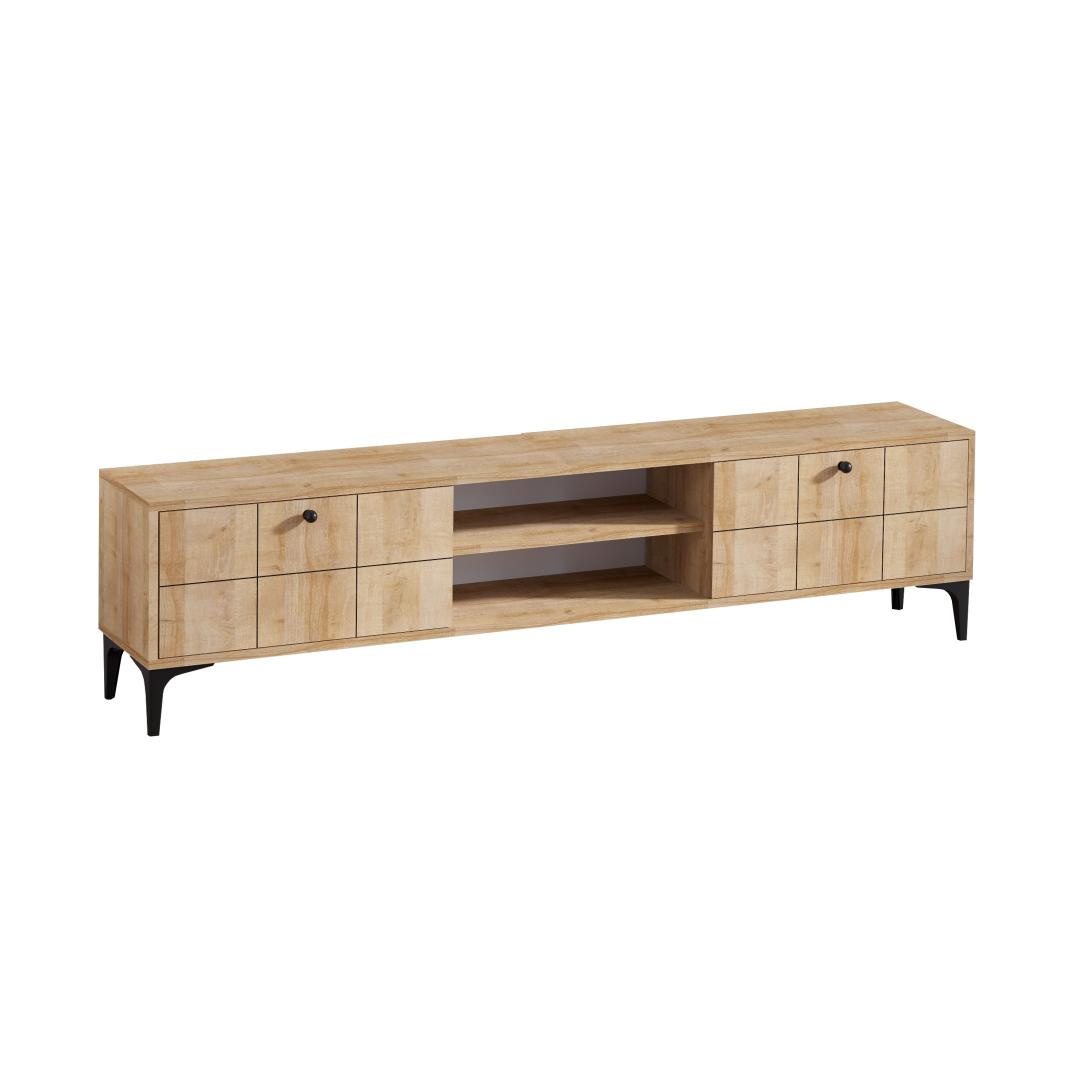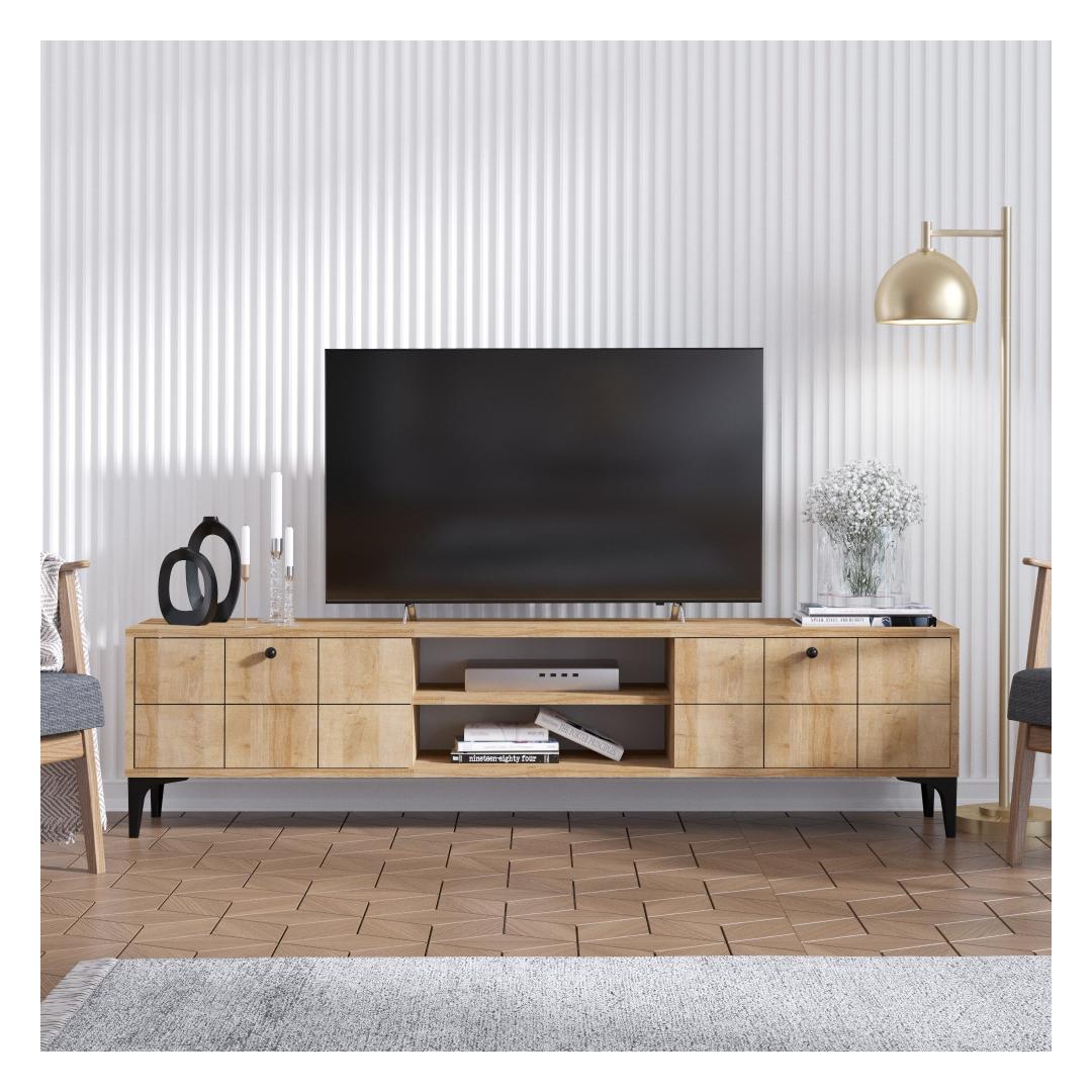 Välistage oma eluruumi kaasaegse ja stiilse teleripuldigaMuuda oma elutuba lummavaks ja kutsuvaks ruumiks meie moodsa teleripuldi abil. See ülima täpsusega ja detailidele tähelepanu pöörates valmistatud teleripult on loodud teie kodu esteetilisuse tõstmiseks, pakkudes samal ajal praktilisi hoiulahendusi. Võrratu vastupidavus ja kvaliteetSee 100% melamiiniga kaetud puitlaastplaadist valmistatud teleri statiiv on valmistatud kestma. 18 mm paksus tagab tugevuse ja stabiilsuse, mis võimaldab teil julgelt asetada sellele oma televiisor ja muud elektroonikaseadmed. Rikkalik hoiuruumTänu arvukatele riiulitele pakub see teleri statiiv rohkelt hoiuruumi teie meediaseadmetele, mängukonsoolidele, dvd-dele ja muule. Keskmine 12 cm kõrgune riiul pakub piisavalt ruumi teie kaablikarbi või mängukonsooli jaoks, samas kui ruumikas ülemine pind mahutab kuni 180 cm laiuseid telereid. Monitoorne disainSelle teleripuldi mitmekülgne disain võimaldab sulanduda sujuvalt mis tahes interjööri stiiliga. Ükskõik, kas eelistate modernset, uudset, tööstuslikku või skandinaavia teemat, see teleripult täiendab teie olemasolevat sisekujundust vaevata. Lihtsad paigaldus- ja seinakinnitusedMeie tv-jalgadel on plastmassist jalad, mis tagavad stabiilsuse ja elegantse välimuse. Lisaks saab seda hõlpsasti seinale kinnitada, mis lisab turvalisust ja mugavust. Tehnilised üksikasjad:Materjal: materjal: 100% melamiiniga kaetud puitlaastplaatPaksus: 18mmLaius: 180cmKõrgus: 55cmSügavus: 31cmKeskmise riiuli kõrgus: 12cmJala kõrgus: 25cmJalad: Jalgade kõrgus: 1,5 cm, jalad: 1,5 cm: PlastistVärv: TammUuendage oma eluruumi meie moodsa teleripuldiga ja kogege stiili ja funktsionaalsuse täiuslikku segu. Tellige kohe ja nautige oma kodus ülimat meelelahutuse seadistust. Värv: Oak