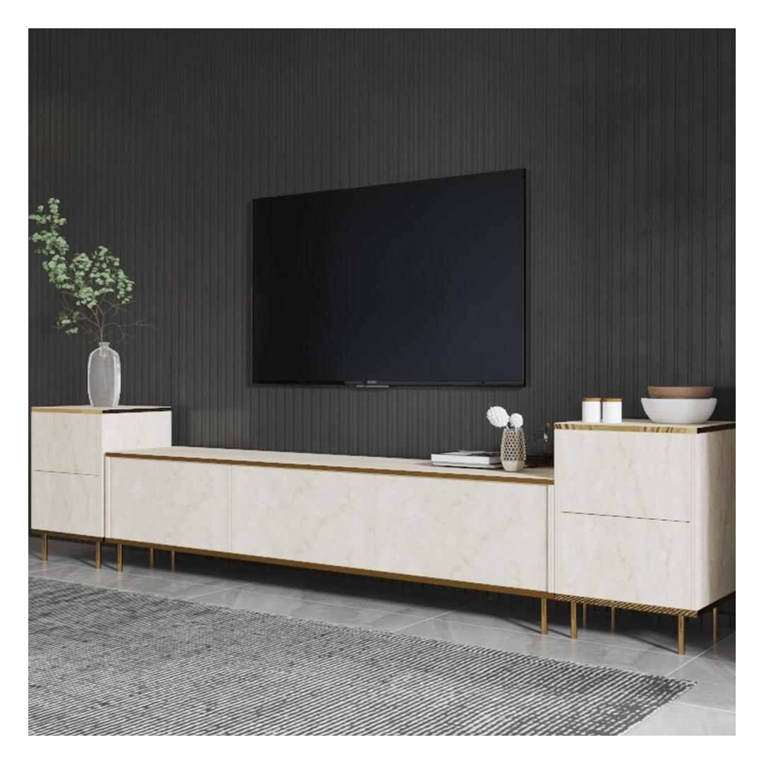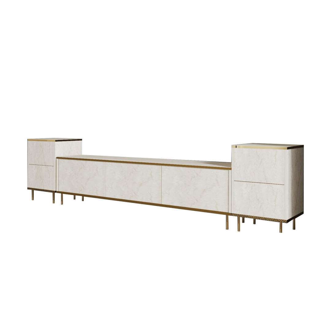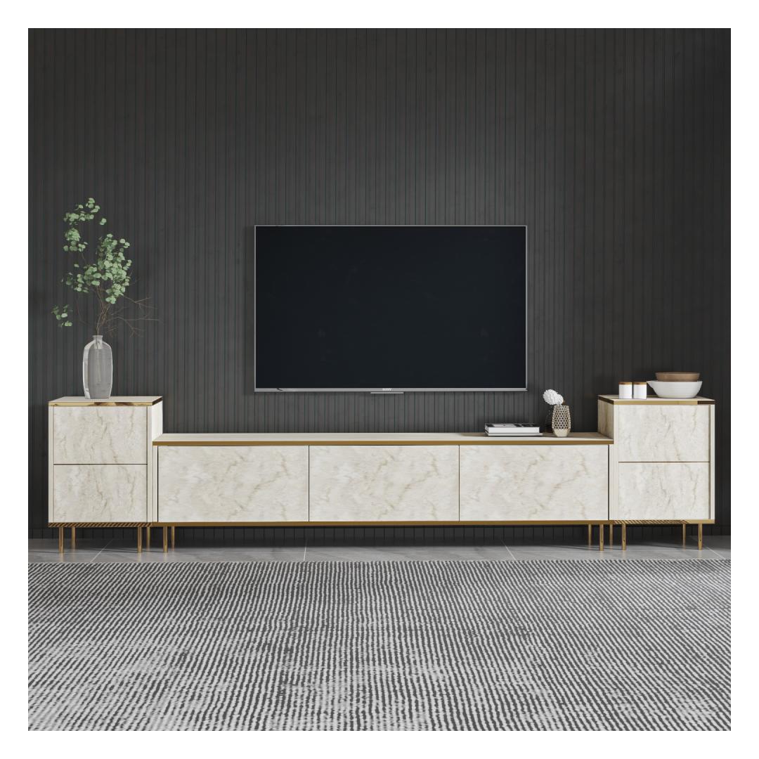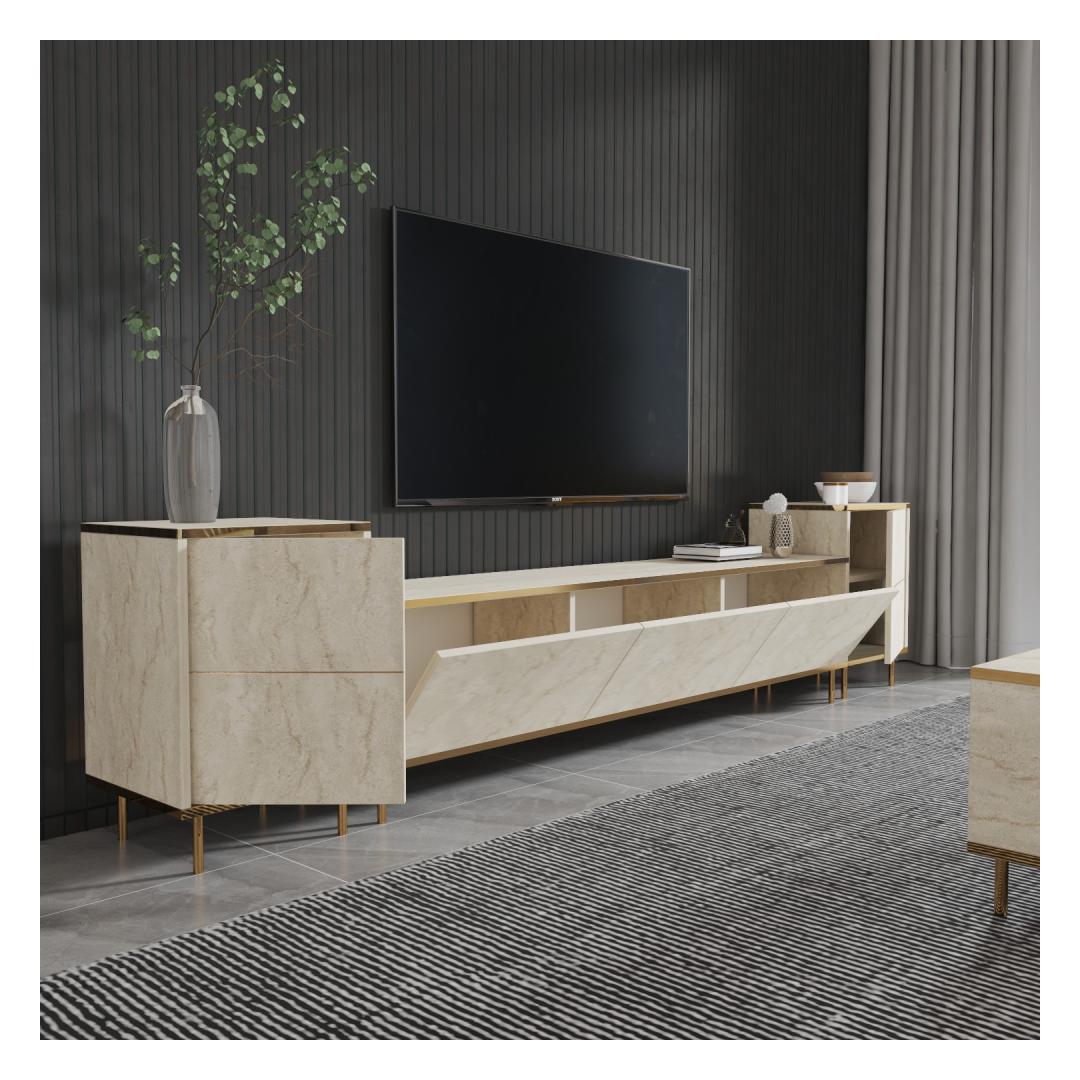 Muuda oma elutuba luksuslikuks ja elegantseks ruumiks meie hämmastava televiisori üksusega Travertiini ja Kuldsega. See televiisori üksus ei ole lihtsalt mööbliese, vaid stiili ja rafineerituse väljendus. Marmorikontseptsioon lisab sinu koju luksuse puudutuse, muutes selle igas toas keskpunktiks.Tõsta oma eluruumiSelle televiisori üksuse voolujooneline disain lisab sinu eluruumile modernsuse puudutuse, samas kui marmorviimistlus toob klassikalise elegantsi. Travertiini ja Kuldse värvide kombinatsioon loob luksusliku esteetika, mis muljet avaldab sinu külalistele ja tõstab sinu kodu üldilmet.Funktsionaalne ja stiilneSee televiisori üksus ei näe mitte ainult ilus välja, vaid pakub ka piisavalt panipaiku kõigi sinu meelelahutuse tarvikute jaoks. Televiisori alus pakub tugevat alust sinu televiisori jaoks, samas kui kapid pakuvad panipaiku DVD-dele, puldid ja muudele esemetel. Hoia end organiseerituna, ohverdamata stiili.Kvaliteetne käsitööValmistatud 100% melamiinkattega puitlaastplaadist, on see televiisori üksus loodud kestma. 18 mm paksus tagab vastupidavuse ja stabiilsuse, nii et saad seda eset nautida aastaid. Kvaliteetsed materjalid ja tähelepanu detailidele teevad sellest televiisori üksusest väärtusliku investeeringu sinu koju.Tehnilised andmed:Materjal: 100% melamiinkattega puitlaastplaatPaksus: 18 mmTeleviisori aluse mõõdud: Laius: 180 cm, Kõrgus: 45,2 cm, Sügavus: 35 cmKapi mõõdud: Laius: 40 cm, Kõrgus: 60 cm, Sügavus: 35 cm (2 tk)Värv: Travertiini ja KuldneKontseptsioon: Marmor Värv: Travertine Gold