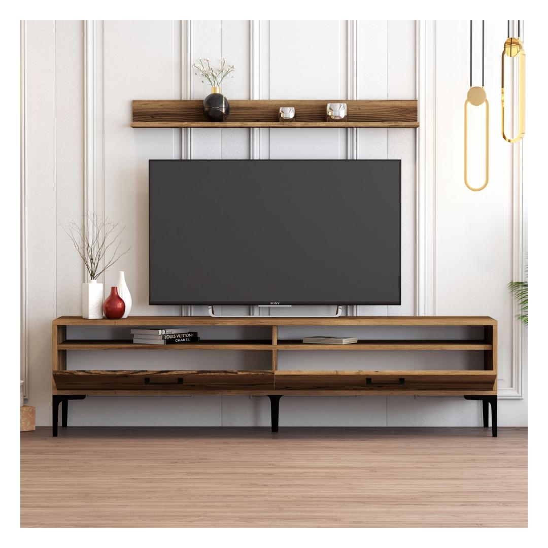 Muuda oma elutuba modernse elegantsi paradiisiks meie uimastava televiisoriga. See ülima täpsusega valmistatud televiisor on loodud selleks, et võluda teie meeli ja tõsta teie kodu sisustus uutesse kõrgustesse. Vabastage elegantsi jõudMeie elegantse ja kaasaegse disainiga teleriba ühendab vaevata stiili ja funktsionaalsuse. 100% melamiiniga kaetud puitlaastplaat tagab vastupidavuse ja pikaealisuse, muutes selle teie kodu täiuslikuks täienduseks aastateks. Pähklipuu värvus lisab sooja ja rafineeritust, luues hubase ja kutsuva atmosfääri.Rikkalik hoiuruumHüvasti segadusega elutuba! meie televiisoril on palju riiuleid, mis pakuvad piisavalt ruumi teie meediaseadmete, dvd-de, raamatute ja muu hoiustamiseks. Seina riiul lisab elegantsi, võimaldades teil välja panna oma lemmik dekoratiivseid esemeid või perefotosid. Võrratu kvaliteetMe usume, et pakume oma klientidele ainult parimat. Seepärast on meie telerikapp valmistatud 18 mm paksusega, mis tagab tugevuse ja stabiilsuse. Metallist jalad ei lisa mitte ainult tööstuslikku võlu, vaid pakuvad ka suurepärast tuge. Plastikust käepide lisab moodsat puudutust, muutes kappide avamise ja sulgemise lihtsaks. Tehnilised üksikasjadTeleri statiiv: Laius: 180 cm, kõrgus: 47 cm, sügavus: 35 cm.Seina riiuli suurus: Laius: 120 cm, kõrgus: 11. 8 cm, sügavus: 16 cmMetallist jalad: 17 cmPlastikust käepideArvukad riiulidVärv: PähkelpuuUuendage oma eluruumi meie teleriga ja kogege stiili ja funktsionaalsuse täiuslikku segu. Tõsta oma kodu sisustus uutele kõrgustele ja loo ruum, mis peegeldab tõeliselt teie isikupära. Tellige kohe ja andke end modernse elegantsi luksusele! Värv: Walnut
