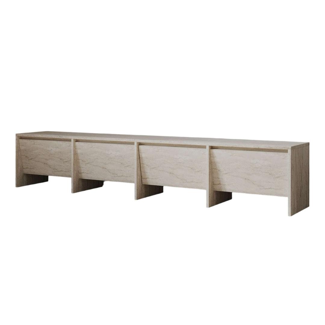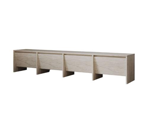 Muuda oma elutuba stiilseks ja organiseeritud ruumiks meie hämmastava Travertine värvi telerialuse abil. See teleriiul ei ole lihtsalt mööbliese, vaid elegantsi ja rafineerituse väljendus.Tõsta oma eluruumiSelle voolujoonelise disaini ja modernse viimistlusega tõstab see teleriiul koheselt sinu elutoa välimust. Travertine värv lisab luksuse puudutuse, muutes selle ideaalseks lisandiks igasse kodu sisustusse.Püsi organiseeritudÜtle hüvasti segaste kaablite ja kaootiliste meelelahutussüsteemidega. See teleriiul pakub piisavalt hoiuruumi, et hoida kõik sinu meedia seadmed, DVD-d ja tarvikud korralikult organiseerituna ja käeulatuses.Kvaliteetne käsitööValmistatud 100% melamiinkattega puitlaastplaadist, on see teleriiul mitte ainult vastupidav ja pikaealine, vaid ka lihtne puhastada ja hooldada. 18mm paksus tagab stabiilsuse ja tugevuse, samas kui 180cm laius pakub piisavalt ruumi sinu teleri ja teiste esemete jaoks.Tehnilised andmed:Materjal: 100% melamiinkattega puitlaastplaatPaksus: 18mmLaius: 180cmKõrgus: 40cmSügavus: 35cmVärv: Travertine Värv: Travertine