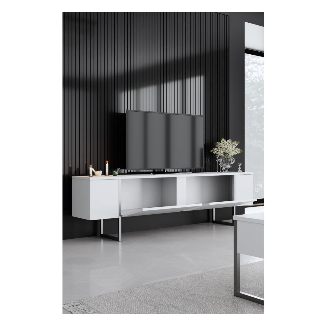Transform your living room into a sleek and modern space with our stunning TV unit. The combination of white and silver colors gives it a contemporary look that will elevate the style of any room. The metal legs add a touch of sophistication, while the 18mm thick melamine coated particle board ensures durability and longevity.