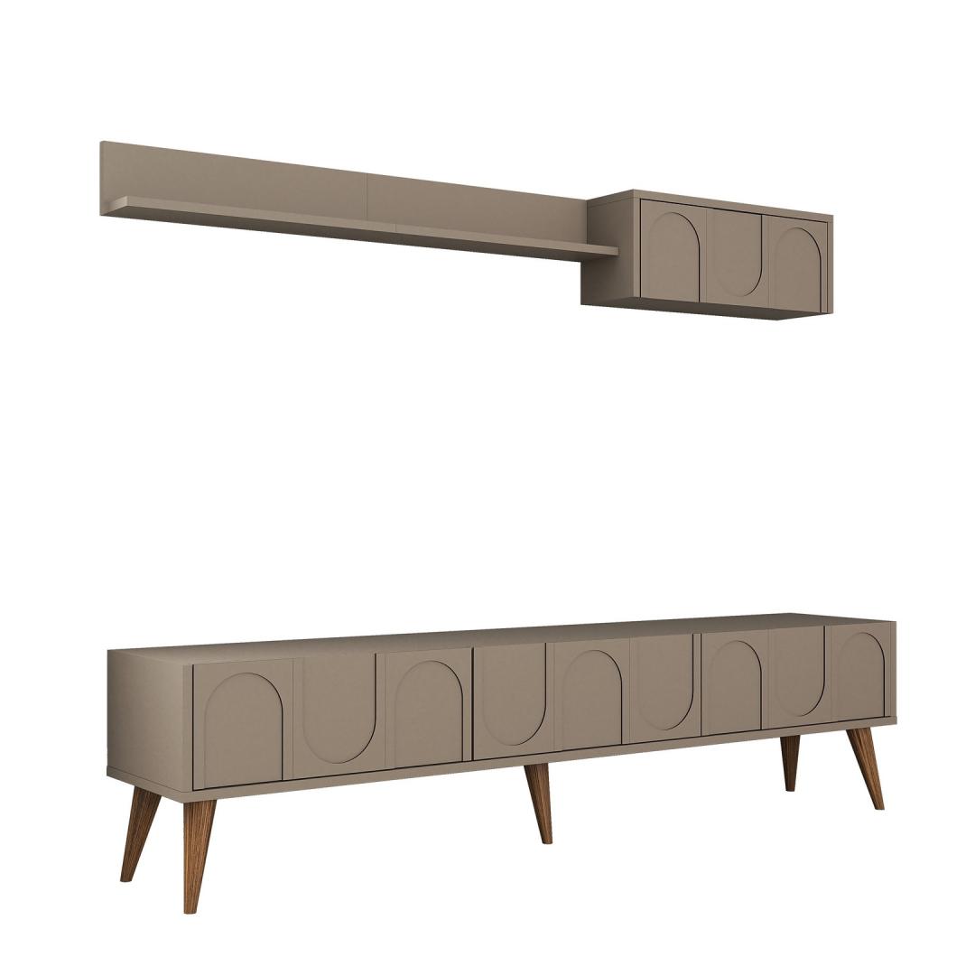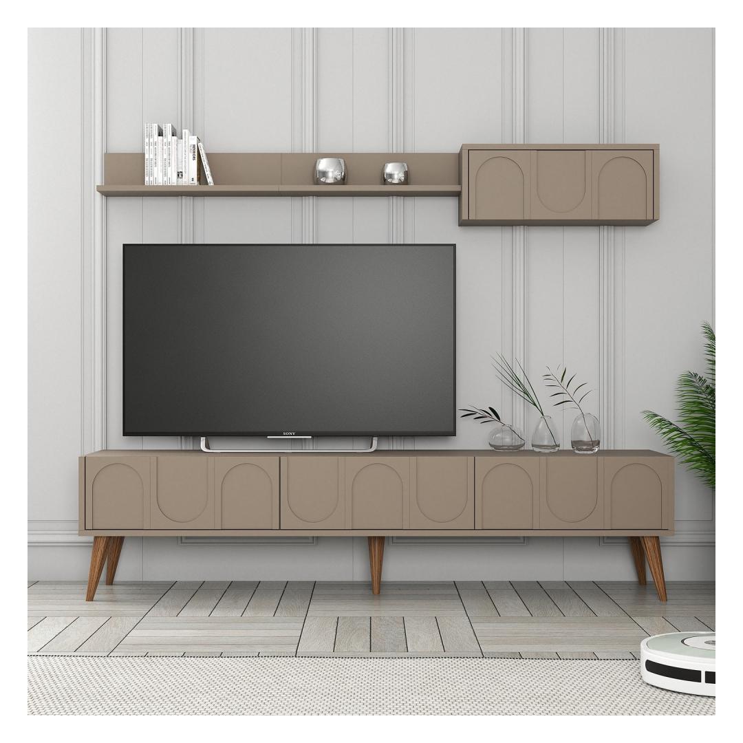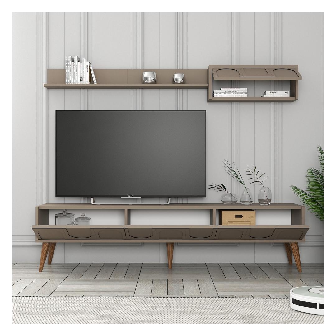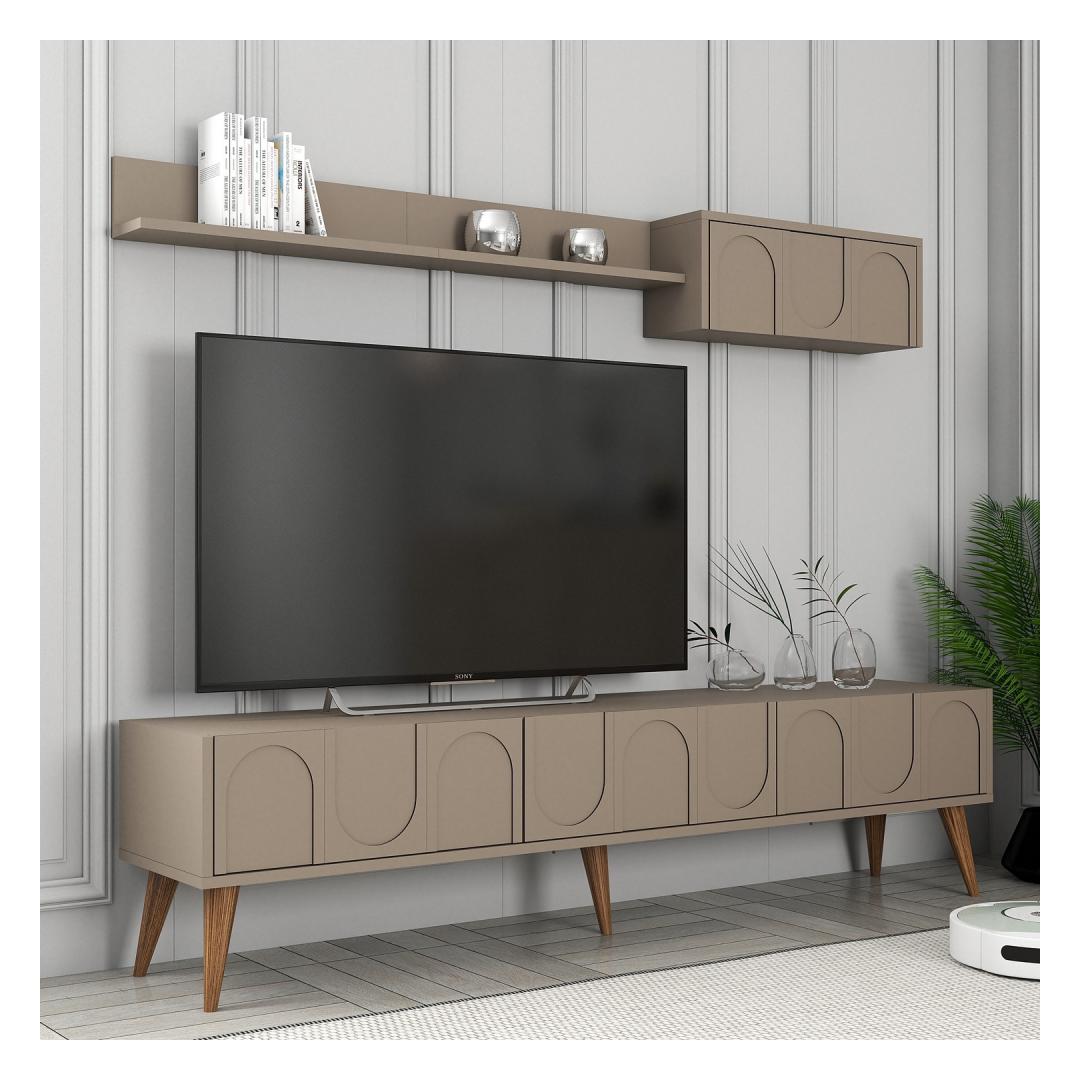 Muuda oma elutuba stiilseks ja organiseeritud ruumiks meie uimastava teleriga. See 100% melamiiniga kaetud puitlaastplaadist valmistatud teleriba ei ole mitte ainult vastupidav, vaid ka uskumatult elegantne ja kaasaegne. Atlase ja pähklipuu värvid lisavad elegantsi igasse ruumi, muutes selle ideaalseks täienduseks teie kodu sisustusele. Organiseeri oma meelelahutusruumiÜtle hüvasti segadusele ja tere korraldusele, sest selle tv-ploki juurde kuuluvad arvukad riiulid. Hoidke oma dvd-d, mängukonsoolid ja muud meelelahutustarbed korralikult paigas, et elutuba oleks puhas ja korras. Sleek ja moodne disainSelle telerikomplekti stiilne disain tõstab koheselt teie elutoa välimust. 18 mm paksune puitlaastplaat lisab rafineeritust, samas kui seinariiul pakub täiendavat hoiuruumi dekoratiivsete esemete või raamatute jaoks. Kergesti paigaldatavSeda telerikomplekti saab hõlpsasti seinale kinnitada, tagades teie meelelahutuse seadistuse stabiilsuse ja ohutuse. Teleri statiivi ja seinariiuli mõõtmed sobivad ideaalselt enamikku elutubadesse, pakkudes piisavalt ruumi teie telerile ja muudele tarvikutele. Tehnilised üksikasjad:Materjal: materjal: 100% melamiiniga kaetud puitlaastplaatPaksus: 18 mmTeleri statiiv: Laius: 180 cm, kõrgus: 44 cm, sügavus: 35 cm.Seina riiuli suurus: Laius: 180 cm, Kõrgus: 24 cm, Sügavus: 29. 5 cmVärv: Atlas ja pähkelpuu Värv: Atlas Walnut