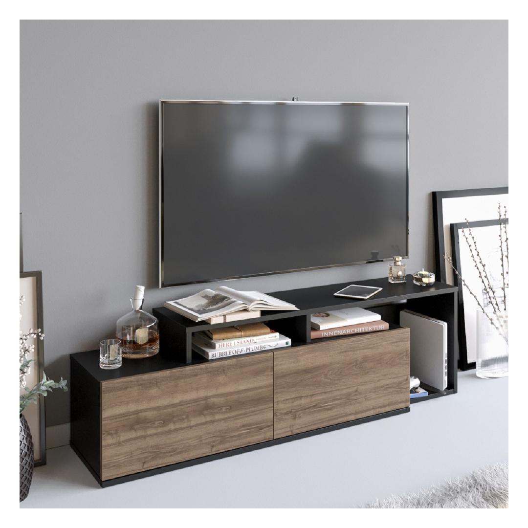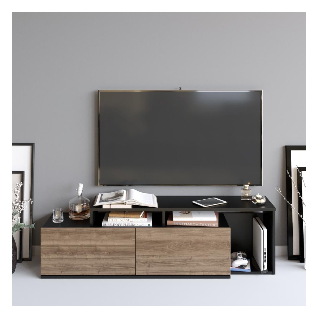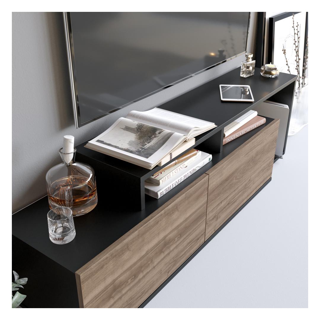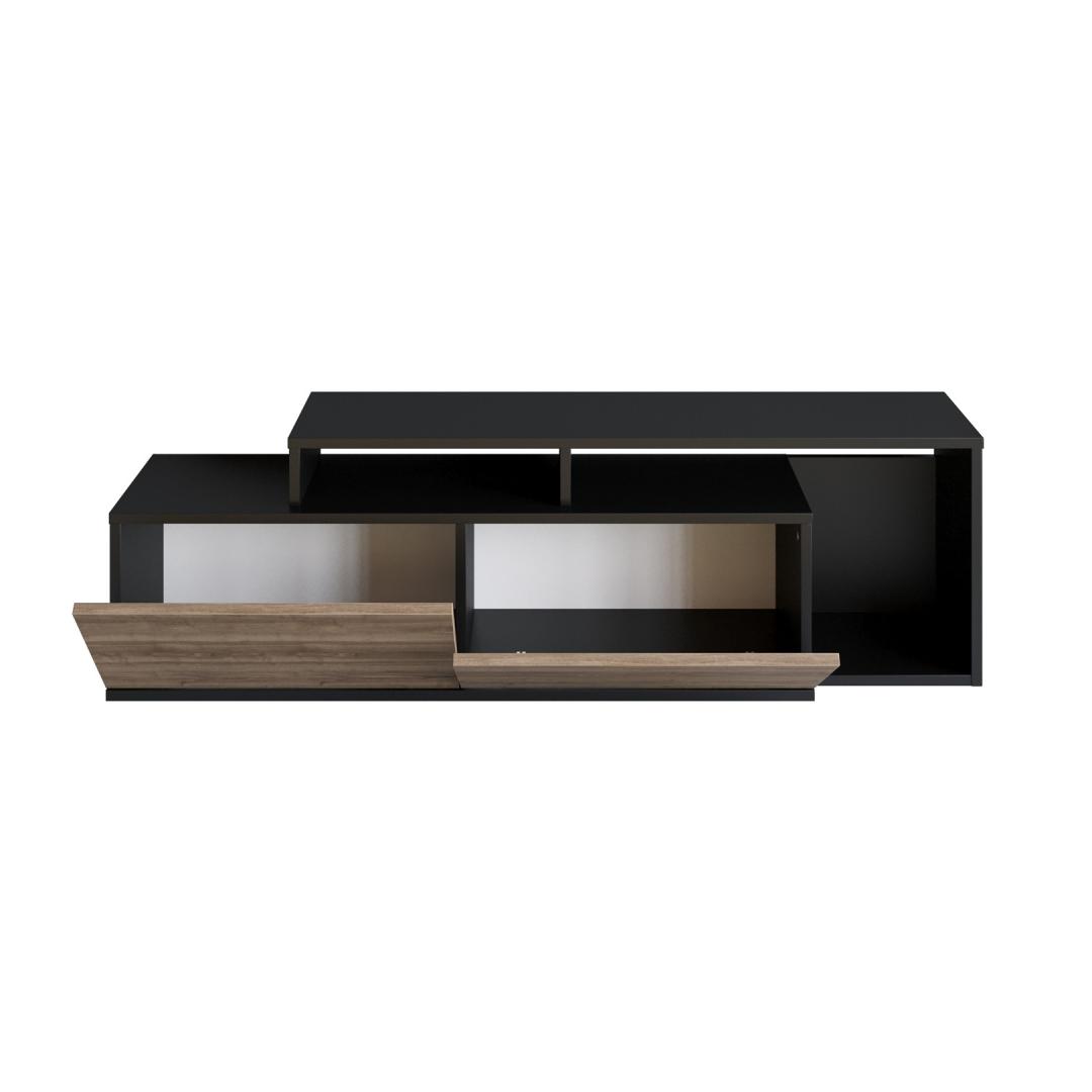 Transform your living room into a contemporary haven with our sleek and sophisticated TV stand. Designed with a solid color concept, this stand adds a touch of modernity and novelty to any space. Its black and walnut color combination effortlessly blends with any decor, making it a versatile addition to your home.