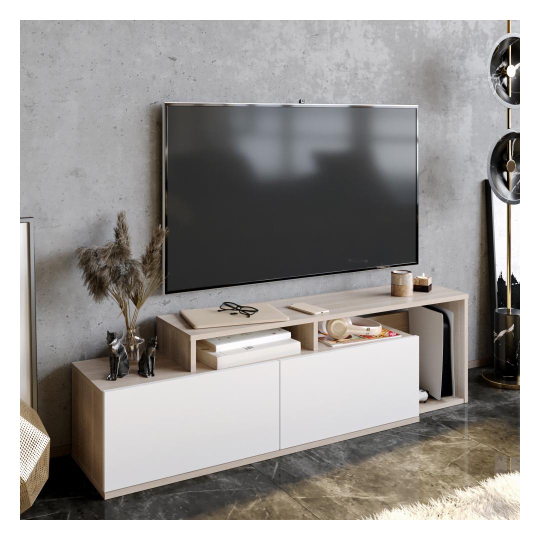 Crafted from 100% melamine coated particle board, this TV stand is built to withstand the test of time. The 18 mm thickness ensures durability and sturdiness, providing a reliable support for your television. Rest assured knowing that your investment in this TV stand will serve you for years to come.