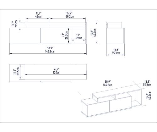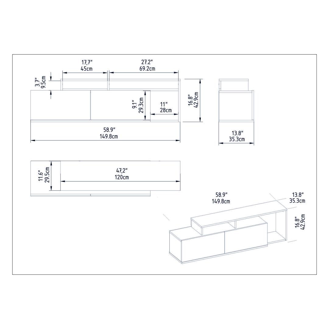 Our TV stand is not only stylish but also practical. Its compact dimensions of 149.8 cm in width, 42.9 cm in height, and 35.3 cm in depth make it ideal for smaller living spaces. Additionally, it can be easily fixed to the wall, saving valuable floor space and creating a more open and spacious feel in your room.