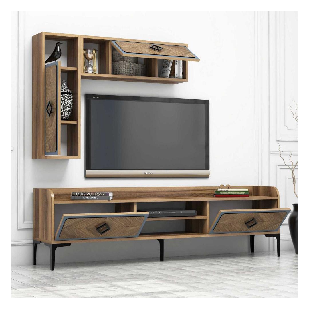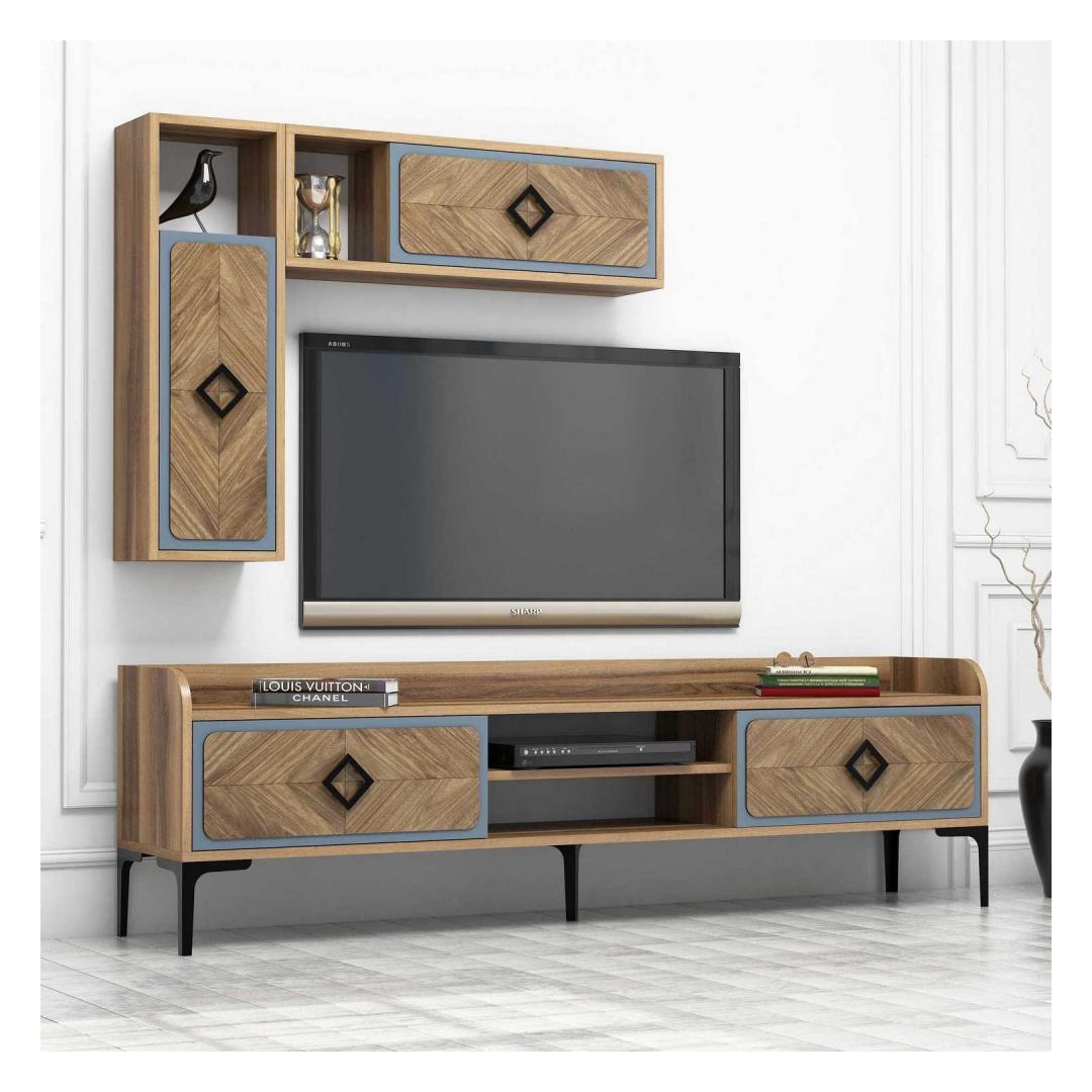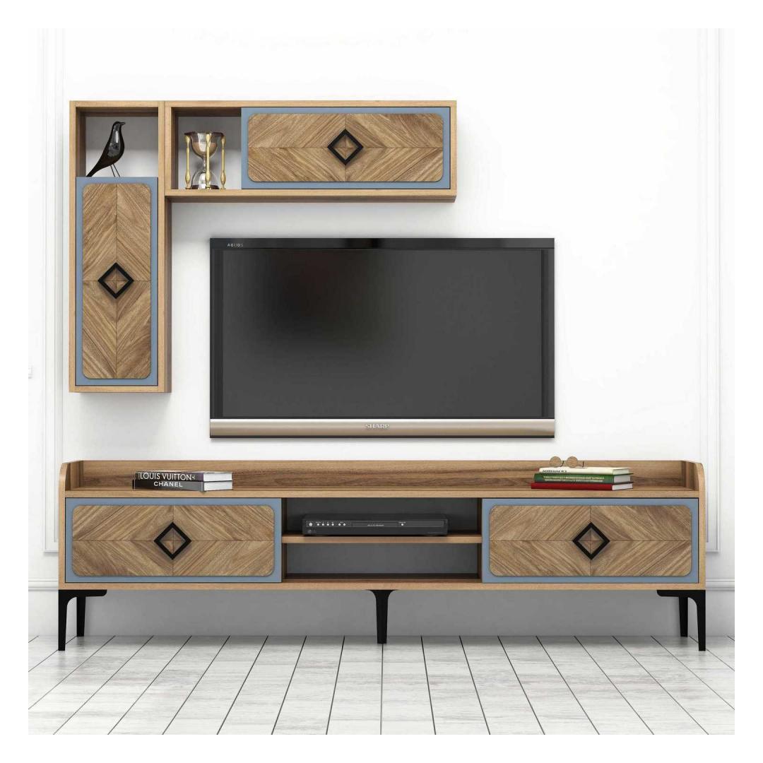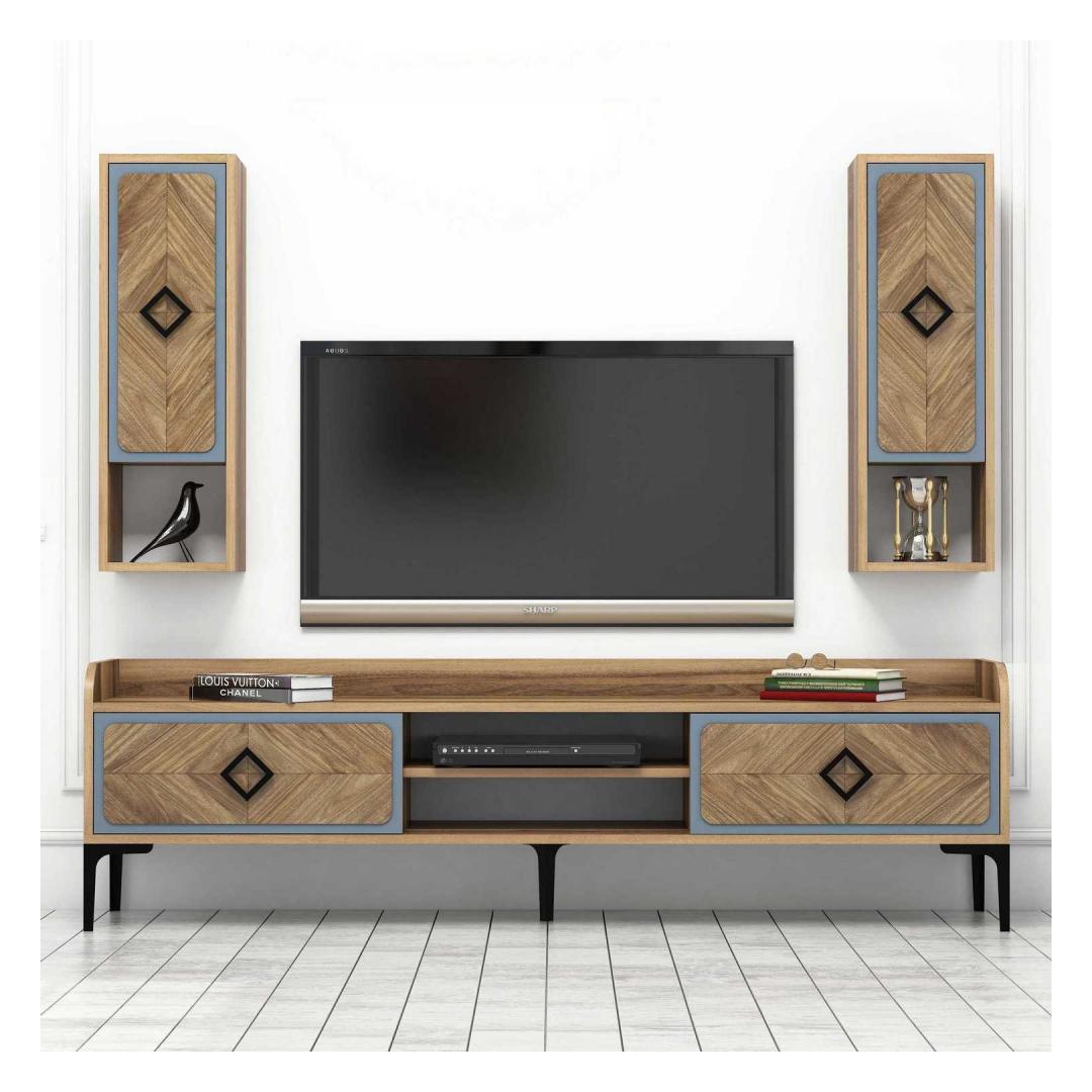 Transformeeri oma eluruum kaasaegse ja stiilse televiisorigaParandage oma elutoa atmosfääri meie suurepärase televiisoriga. Täpselt ja elegantselt valmistatud teler on loodud selleks, et tuua teie ruumi modernsust ja uudsust. Selle tööstuslikust inspireeritud disain lisab ainulaadset võlu, mis võlub teie külalisi ja jätab nad imestama.Võrratu vastupidavus ja kvaliteetValmistatud 100% melamiiniga kaetud puitlaastplaadist, see teler on ehitatud kestma. Paksus 18 mm tagab erakordse tugevuse ja stabiilsuse, pakkudes telerile ja teistele meelelahutusseadmetele tugevat alust. Võite olla kindel, et see seade peab vastu aja katsumusele, võimaldades teil nautida selle ilu aastaid. Rikkalik hoiuruumTänu arvukatele riiulitele pakub see televiisoripaneel rohkelt hoiuruumi kõigile teie meediatarvikutele. Alates dvd-dest kuni mängukonsoolideni saate oma asjad kenasti organiseerida ja välja panna, hoides oma elutoa segadusteta. Seina riiul, mis kuulub seadme juurde, lisab lisafunktsionaalsust ja stiili. Monitoorne ja hõlpsasti paigaldatavSeda televiisorikomplekti saab hõlpsasti seinale kinnitada, andes teile vabaduse valida selle jaoks ideaalne koht teie elutoas. Olenemata sellest, kas eelistate seda eraldiseisvana või olemasoleva mööbliga integreerituna, kohandub see vaevata vastavalt teie vajadustele. Pähklipuu ja sinise värvikombinatsioon lisab sellele kaasaegset hõngu, muutes selle igas ruumis suurepäraseks keskseks elemendiks. Tehnilised üksikasjad:Materjal: Materjal: Materjal: Materjal: Materjal: Materjal: Materjal: Materjal: materjal: 100% melamiiniga kaetud puitlaastplaatPaksus: 18mmTelerikapi mõõtmed: Laius: 180cm, kõrgus: 52cm, sügavus: 35cm.Seina riiuli mõõtmed: Laius: 27. 4cm, kõrgus: 84cm, sügavus: 20cm (2 tk).Värv: Pähklipuu ja sinineKontseptsioon: Kaasaegne - uudsus, tööstuslik Värv: Walnut Blue