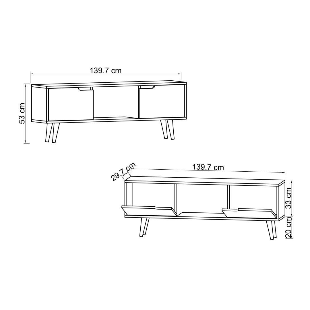 Muuda oma elutuba stiilseks ja organiseeritud ruumiks meie kauni telerialuse abil. 100% melamiinkattega puitlaastplaadist valmistatud telerialus on mitte ainult vastupidav, vaid lisab ka elegantsi sinu kodu sisustusele. Puitjalad tõstavad aluse, andes sellele modernse ja voolujoonelise välimuse, mis jätab mulje sinu külalistele.Hoia organiseeritud ja segadusetaPaljude riiulitega pakub see telerialus piisavalt hoiuruumi kõigi sinu meedia seadmete, DVD-de ja dekoratiivsete esemete jaoks. Riiuli kandevõime 30 kg tagab, et sinu teler ja muud esemed on kindlalt paigal. Sa saad ka selle aluse seina külge kinnitada, et tagada lisastabiilsus ja ohutus.Tõsta oma kodu sisustusSelle telerialuse pähklipuu värv lisab igasse ruumi soojust ja rafineeritust. Selle voolujooneline disain ja puhtad jooned teevad sellest mitmekesise mööblieseme, mis sobib igasuguste sisustustüüpidega, alates modernsest kuni traditsioonilise. Olgu sa siis oma lemmiksaate vaatamas või filmiõhtut korraldamas, see telerialus on sinu elutoa keskpunkt.Tehnilised andmed:Materjal: 100% melamiinkattega puitlaastplaatPuitjalad: 20 cmRiiuli kandevõime: 30 kgLahtivõetav toodeMõõdud: Laius 139,7 cm, Kõrgus 53 cm, Sügavus 53 cmVärv: Pähklipuu Värv: Walnut