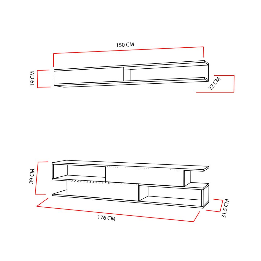 - TV Unit Size: Width: 176 cm, Height: 39 cm, Depth: 31.5 cm