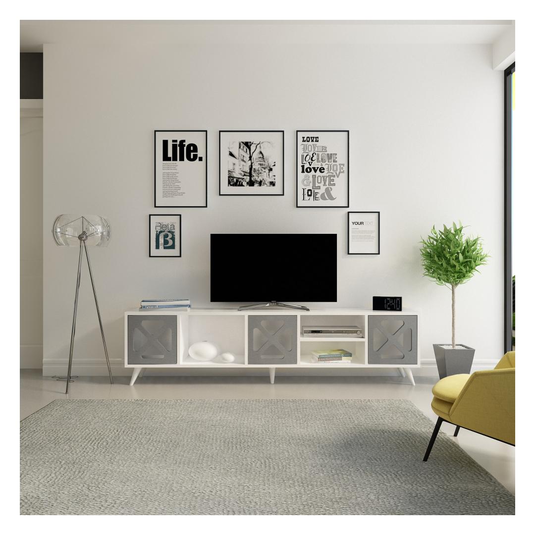 Made from 100% melamine coated particle board, our TV stand is not only durable but also visually appealing. The white and anthracite colors blend seamlessly together, creating a stunning piece that will add a touch of elegance to your home.