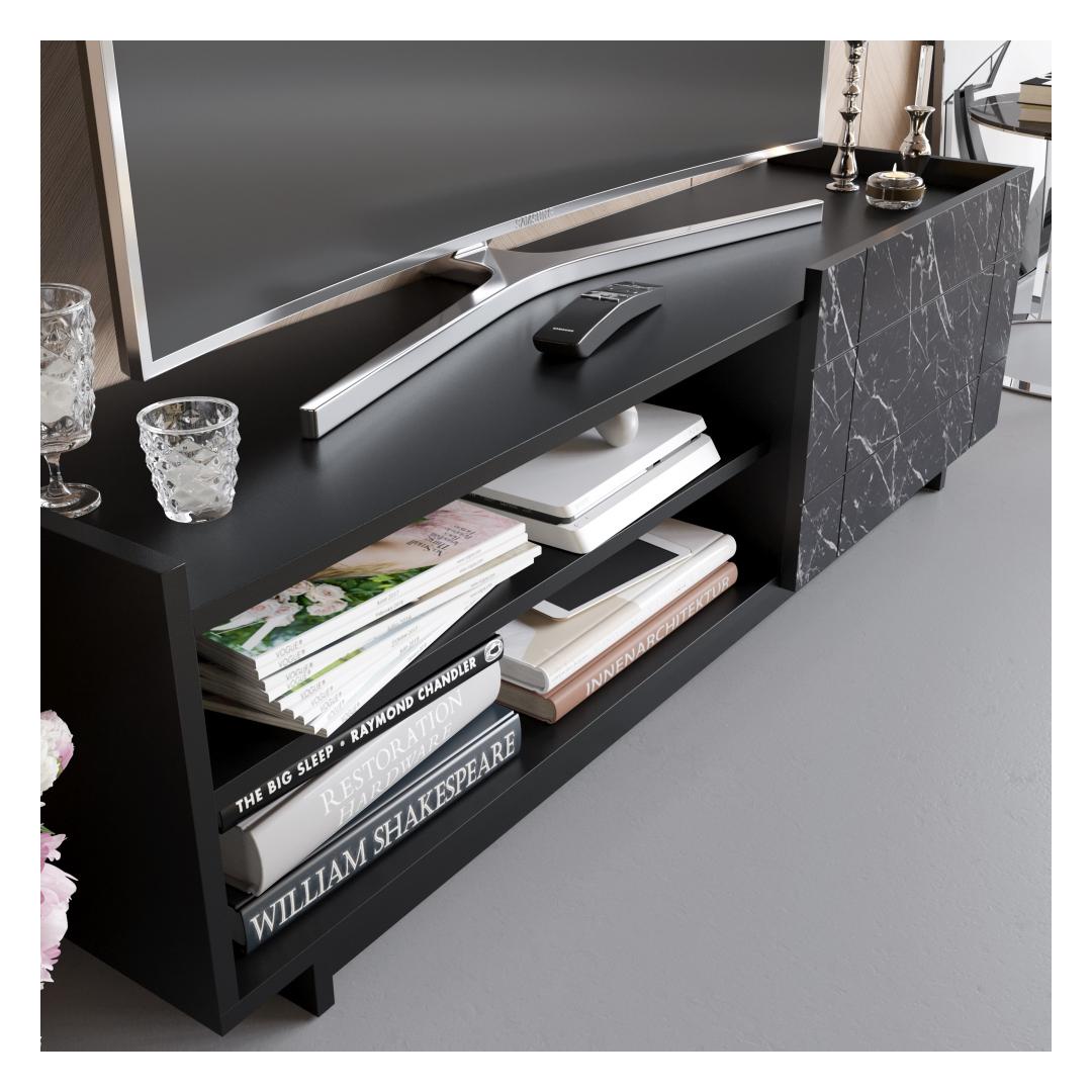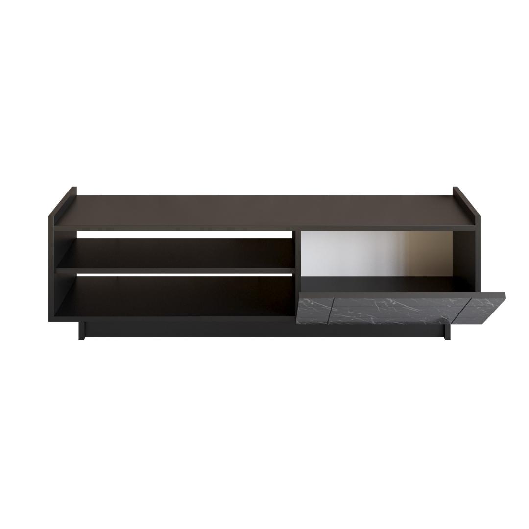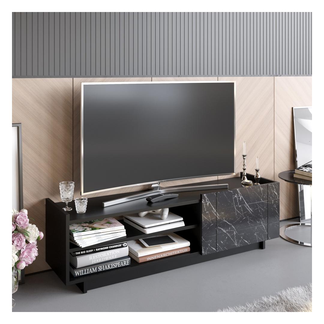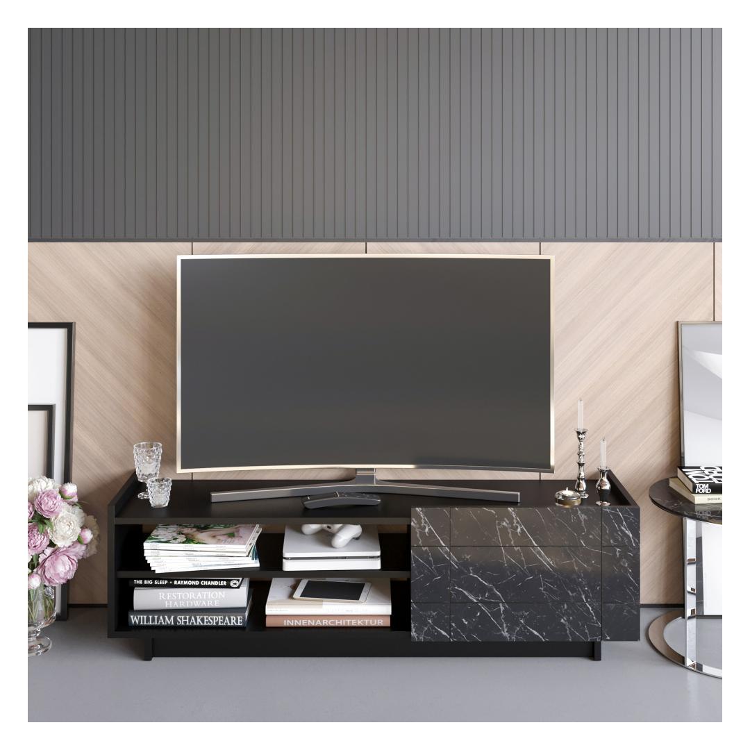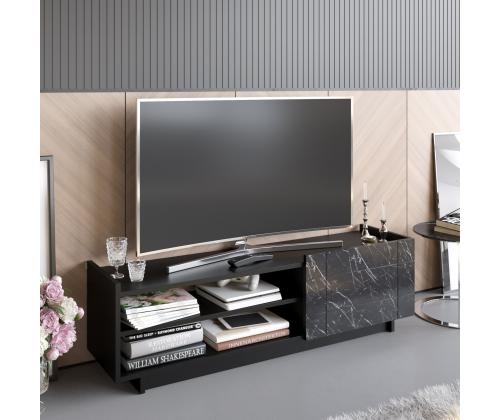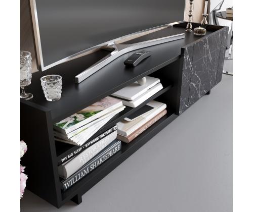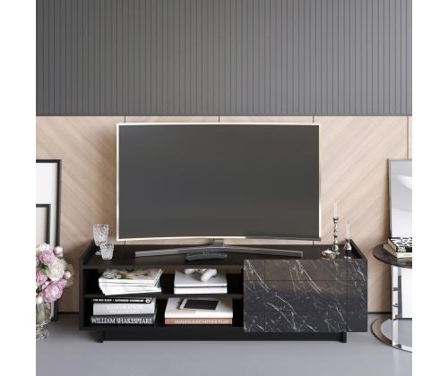 The TV Stand features a captivating combination of black and marble colors, creating a visually striking piece that will instantly catch the eye. The plain, solid black color adds a touch of elegance, while the marble accents bring a sense of luxury and opulence.