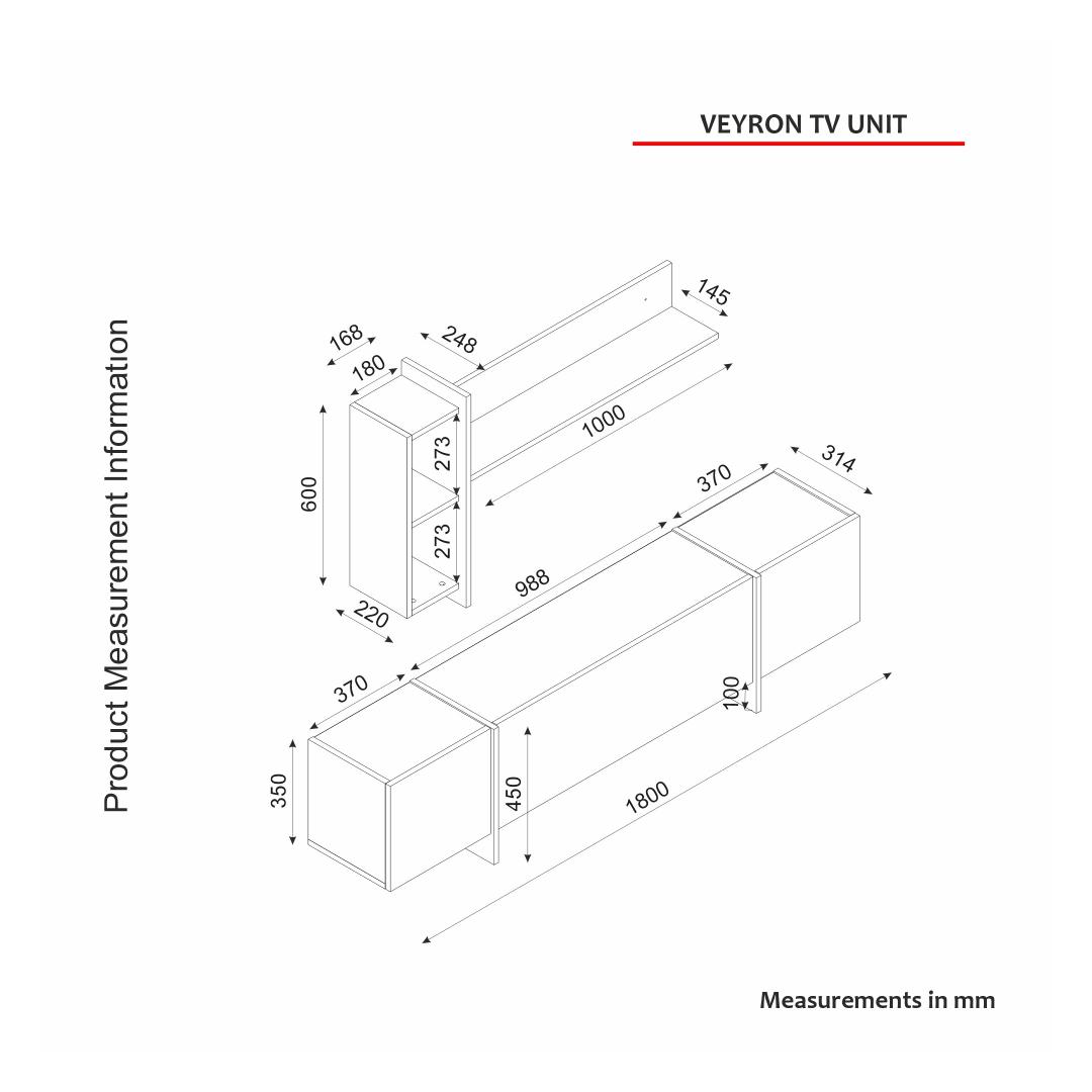 - TV Unit Size: Width: 180 cm, Height: 45 cm, Depth: 32.3 cm
