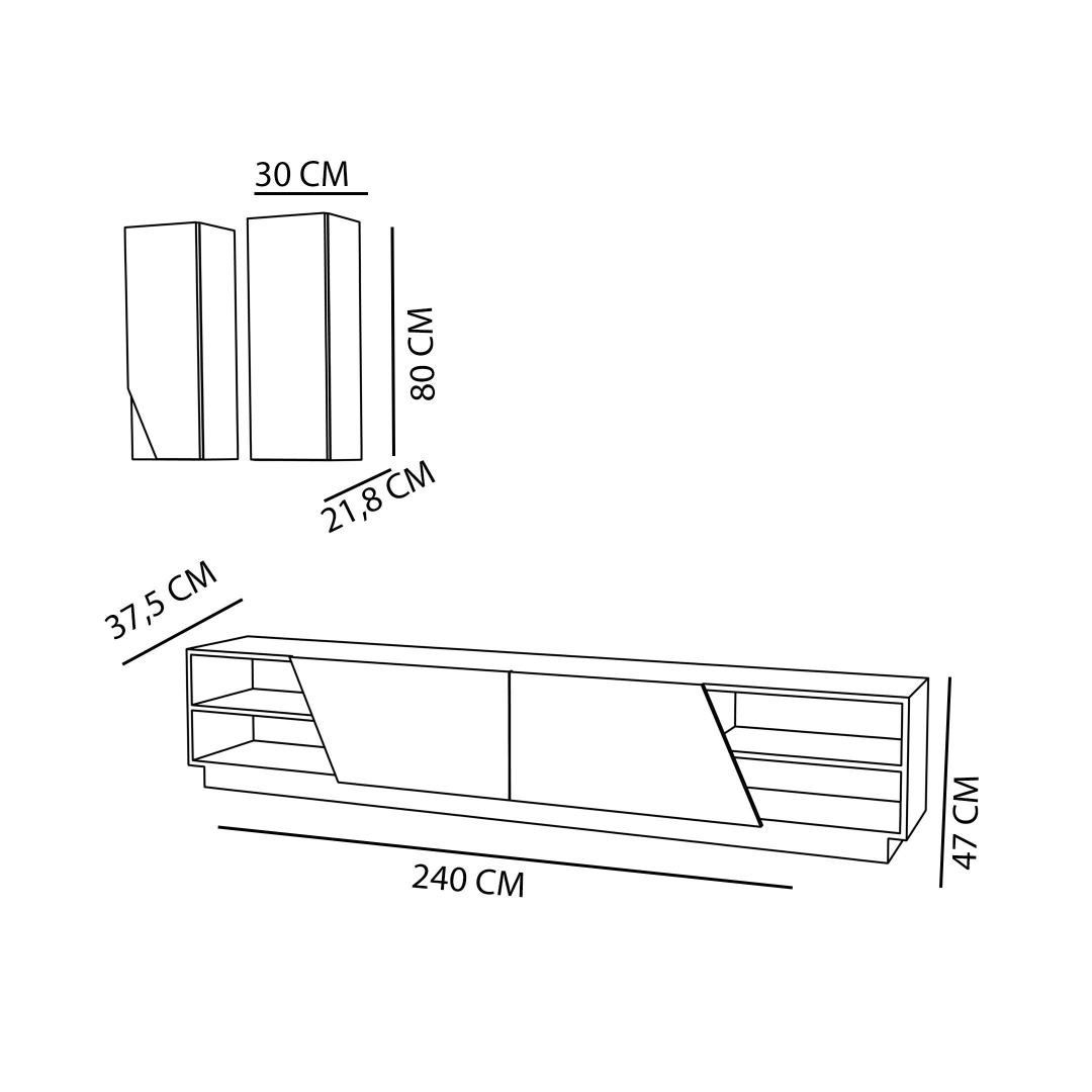- TV stand size: Width: 240 cm, Height: 47 cm, Depth: 37.5 cm
