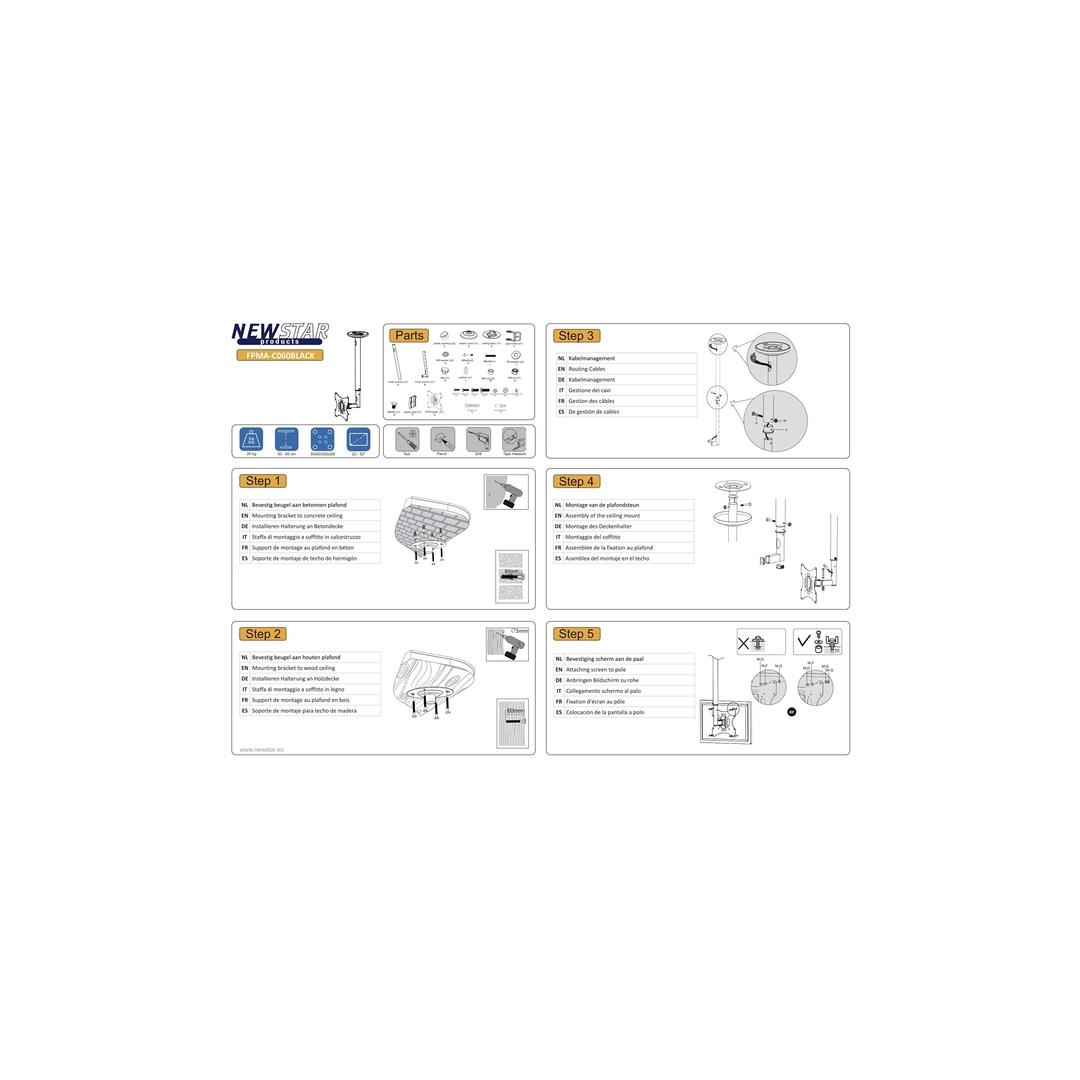 NewStar FPMA-C060BLACK -jalustassa on kaksi nivelpistettä ja se soveltuu enintään 40" (100 cm) näytöille. Tämän tuotteen painokapasiteetti on 20 kg. Kattokiinnike sopii näytöille, jotka täyttävät VESA-reikäkuvion 50x50 tai 200x200mm. Eri reikäkuviot voidaan kattaa NewStar VESA-sovitinlevyillä.