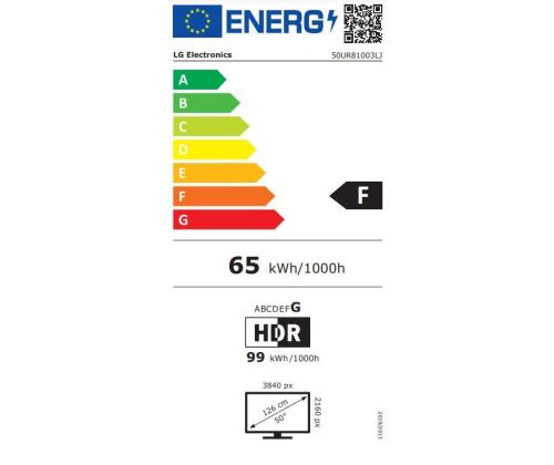 50"|4K/Smart|126cm|Form factor 16:9|Resolution 3840x2160|3xHDMI|2xUSB 2.0|1xOptical S/PDIF|1xRJ45|2xRF-In|1xCI Slot|Refresh rate 60 Hz|Speakers|Speaker Output 10W + 10W|Wireless LAN|Bluetooth|TV OS webOS|Colour Dark Blue|Energy efficiency class F