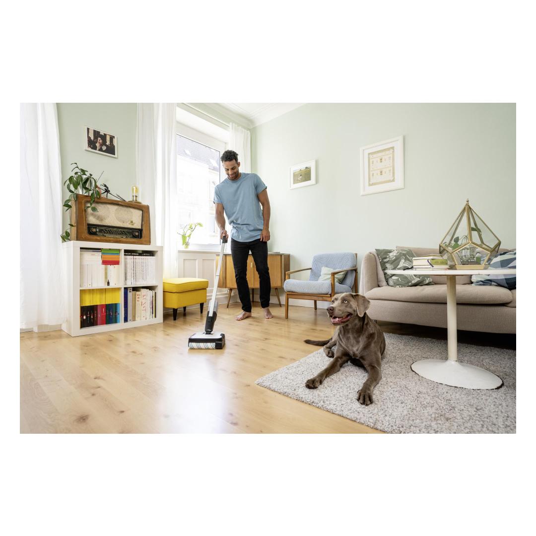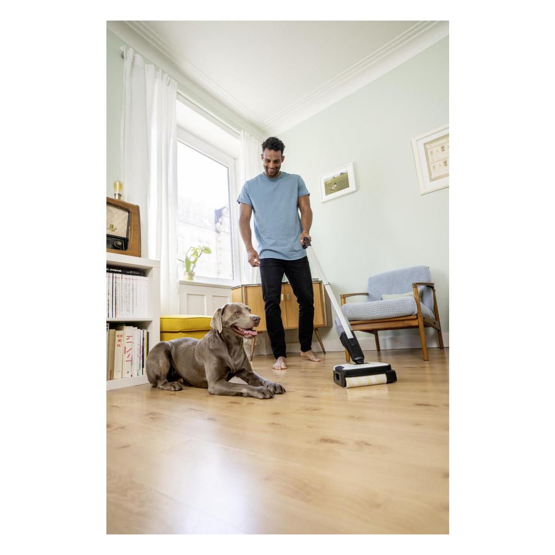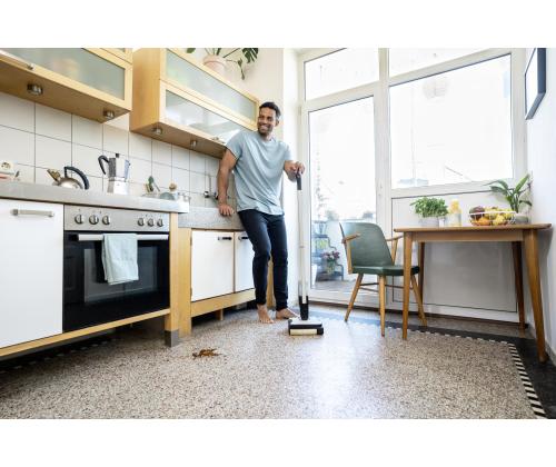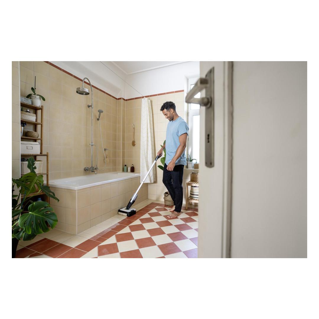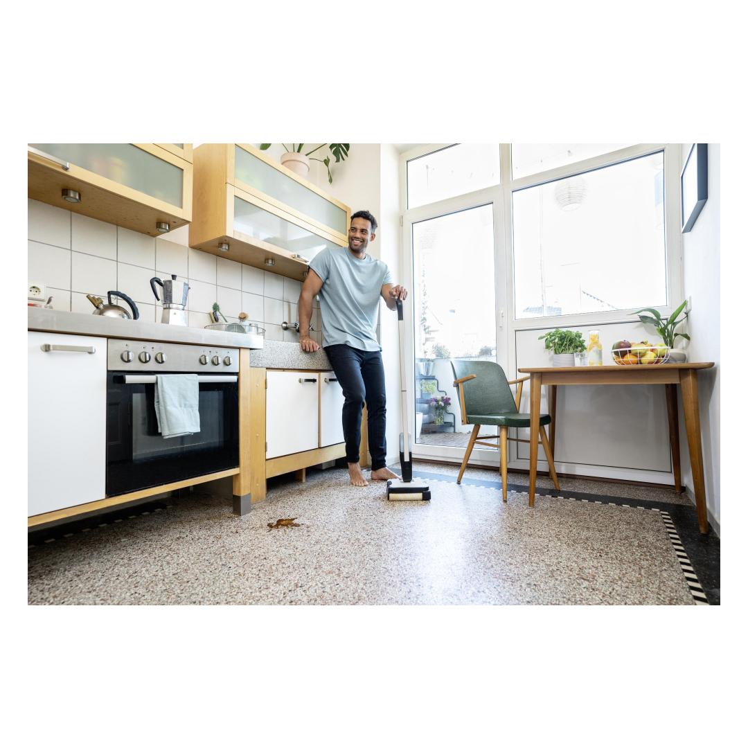 The FC 2-4 floor cleaner impresses with its self-standing design, a low weight of just 2.2 kilograms and automatic switching on and off. To do this, pull the handle of the cleaner backwards to start and remove dry and wet everyday dirt conveniently in just one step. The maximum battery run time per battery charge is 20 minutes, which corresponds to a cleaning area of 70 square metres. After the device is activated, the roller is automatically moistened with the water from the fresh water tank. This ensures even and effective cleaning of hard floors. It also cleans right up to the edge and picks up hairs easily thanks to integrated hair filters. The integrated, hygienic dirty water tank also means contact with dirt is avoided. This can be removed and cleaned directly after using the device. The included 4 V Kärcher Battery Power exchangeable battery is compatible with all 4 V Kärcher Battery Power devices.