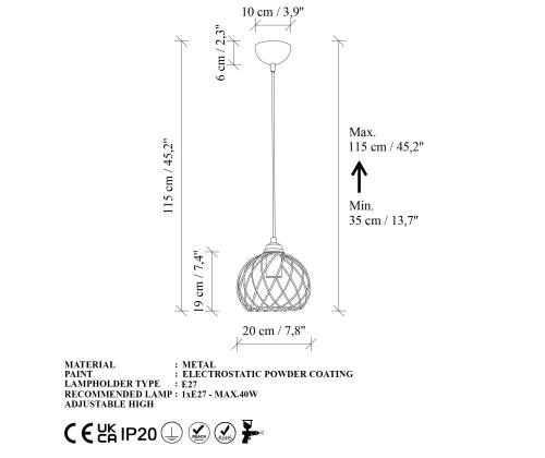 Muuda oma eluruum meie hämmastava metallist lühtriga, tõeliselt silmapaistva detailiga, mis tõstab iga toa elegantsuse ja lummava sära abil. See lühter ei ole lihtsalt valgusallikas, vaid kunstiteos, mis jätab su külalised imetlema.Elegantne Disain, Lummav SäraSelle lühtri sujuv metallkorpus ja must värv kiirgavad rafineeritust ja stiili, muutes selle ideaalseks lisandiks igasse kaasaegsesse või traditsioonilisse sisustusse. Metallist kate lisab luksuse puudutuse, samas kui suurus 20 x 20 x 115 cm teeb sellest teie ruumi ideaalse fookuspunkti.Loo Soe ja Kutsuv AtmosfäärValgusta oma kodu selle lühtri sooja ja kutsuva säraga, luues hubase õhkkonna, mis sobib ideaalselt lõõgastavateks õhtuteks või külaliste meelelahutamiseks. 1 x E 27 Max 40 W pesatüüp võimaldab sul kohandada valgustust vastavalt oma vajadustele, olgu need siis pehmed, ümbritsevad tuled või heledamad, fokuseeritud valgustused.Tehnilised Üksikasjad:Suurus: 20 x 20 x 115 cmKatte suurus: Ø20 h:18 cmPõhilaud: Ø10 h:6 cmPesatüüp: 1 x E 27 Max 40 WPirn ei ole kaasas220-240 VIP kood: IP20Värv: Must Värv: Black