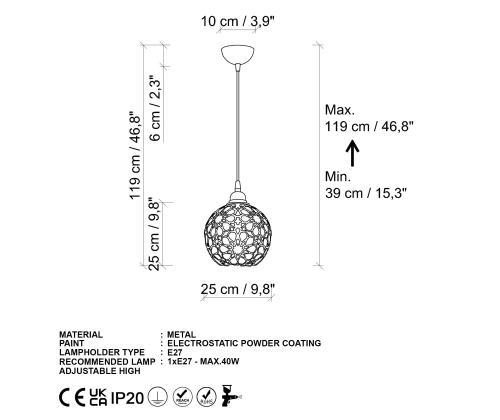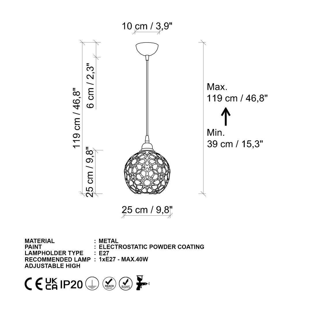 With a diameter of 25 cm and a total height ranging from 39 to 119 cm, this chandelier is the perfect size to make a statement without overwhelming your space. The soft, warm glow of the E27 bulb (not included) will create a cozy ambiance that is perfect for relaxing or entertaining.