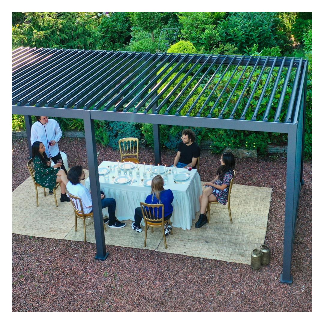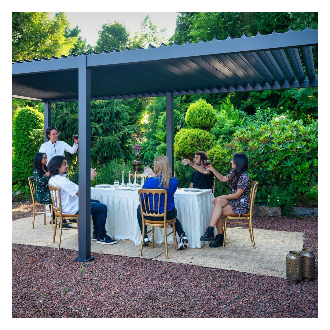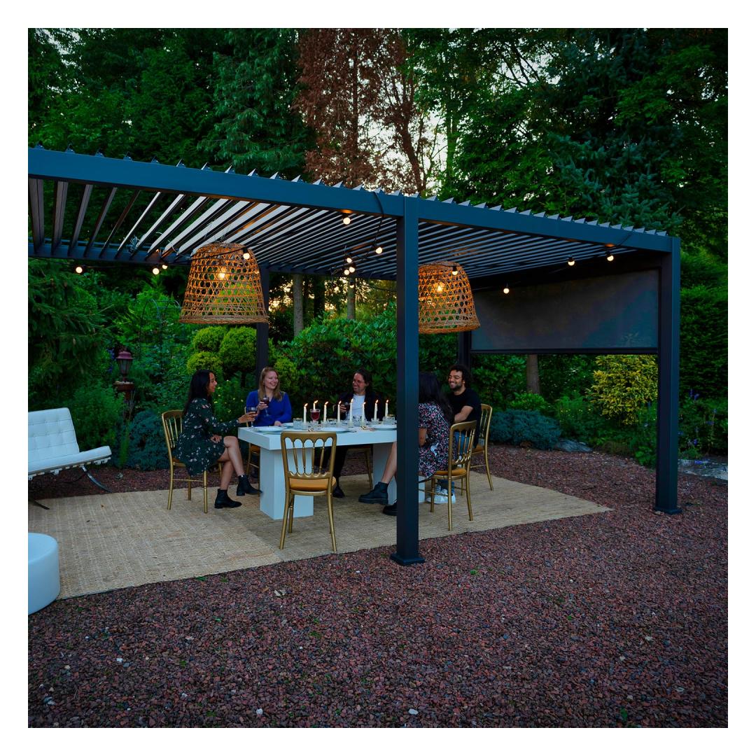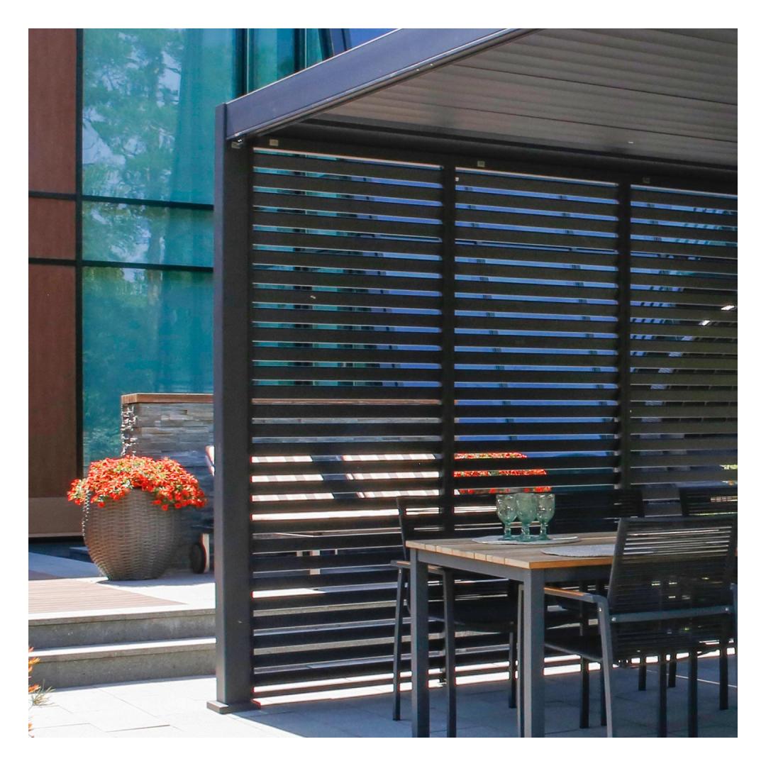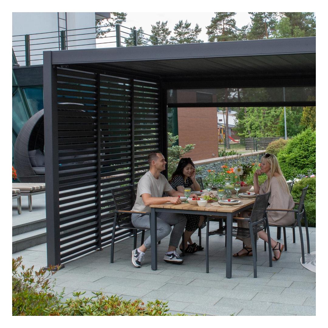 The modern, elegant, and functional canopy/garden pavilion will fit everywhere - the garden, terrace, by the pool, or as a car shelter and it can be used all year round. The innovative louvered roof can be opened and closed with a crank, offering protection and shade from light rain and scorching sun. With closed lamellas, the roof is completely water-repellent. Thanks to the built-in rainwater system, the water is drained safely from the roof.