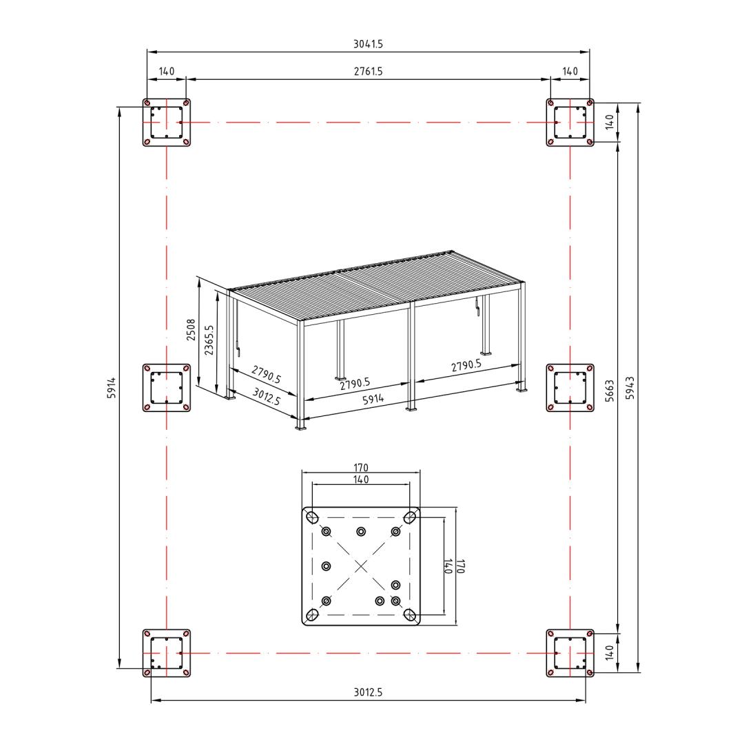 6 support poles 111x111mm, horizontal beam 140x75mm, galvanized steel roof louvers 173x30mm.