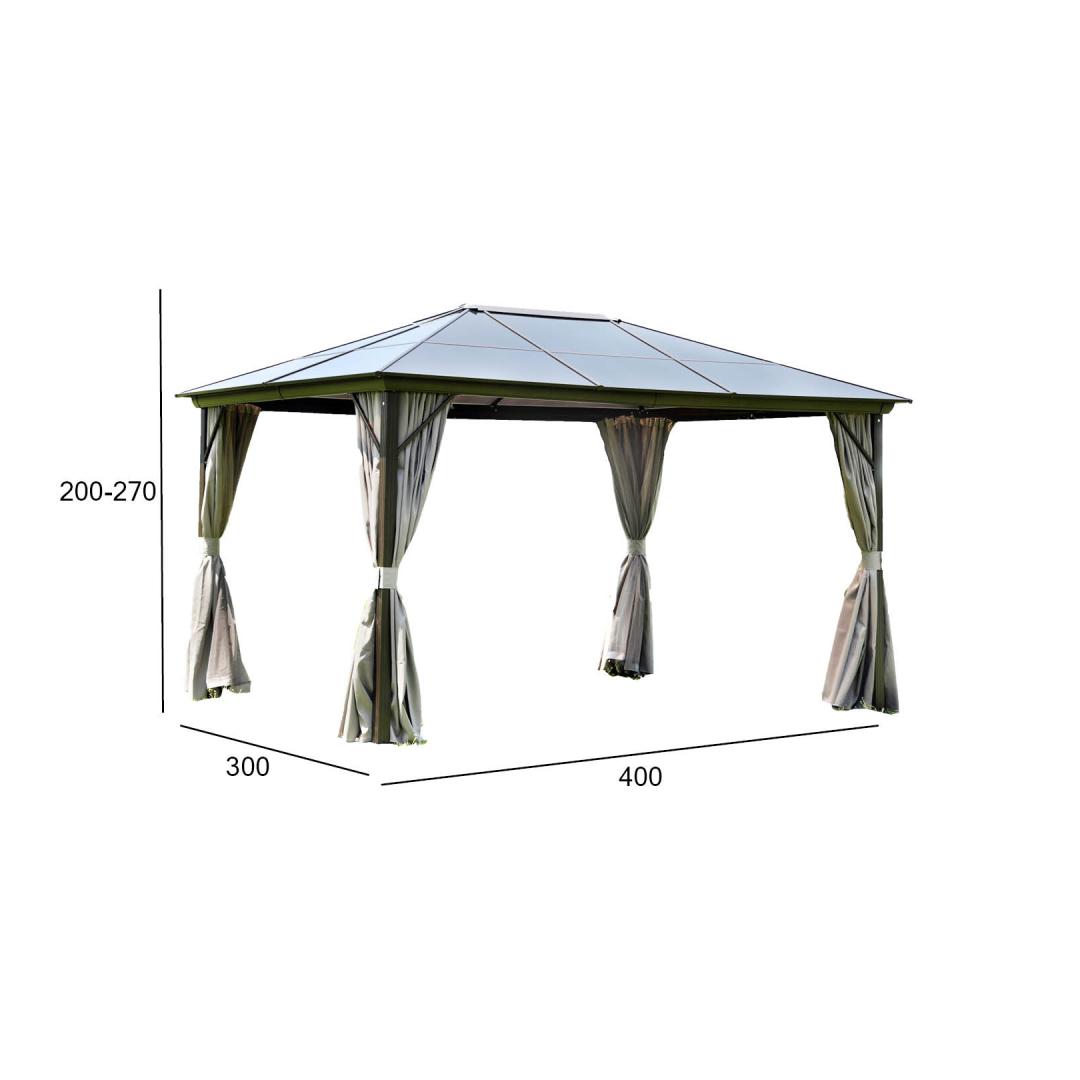 Katos SUNSET 3x4xH2/2,7m, ruskea/beige. Tyylikäs ja toimiva markiisi/katos, joka tarjoaa suojaa ja varjoa kevyeltä sateelta ja paahtavalta auringolta, jolloin voit nauttia ulkoilmasta säästä ja vuorokaudenajasta riippumatta. Markiisin kaikilla sivuilla on polyesterikangasverhot (180 g/m²) ja nailonista valmistetut hyttysverkot, jotka sulkeutuvat lukolla. Markiisin päärakenne on valmistettu alumiinista. Kaikki rungon osat on viimeistelty ruskealla pulverimaalilla. Sivutolppien mitat ovat 76x76mm, poikkipalkin 116x76mm ja kattokylkien 29x26mm. Kattopaneelit: 6mm polykarbonaattia tai laminoitua muovia. Polykarbonaatti on säänkestävä, ympäristöystävällinen materiaali, joka tarjoaa ainutlaatuisen yhdistelmän kestävyyttä ja erinomaista iskunkestävyyttä. Materiaalilla on myös hyvä valonläpäisykyky ja korkea lämmönkestävyys. VAROITUS: Äärimmäisissä sääolosuhteissa tai myrskyvaroituksen sattuessa älä jätä katosta ilman valvontaa. Kova tuuli, sade tai lumi voi vahingoittaa katosta. HUOLTO: Markiisin käyttöiän pidentämiseksi on suositeltavaa, että se puretaan kesäkauden lopussa ja säilytetään viileässä, kuivassa ja hyvin tuuletetussa tilassa. Jos katos jätetään talveksi pystyyn, on huolehdittava siitä, ettei katolle kerry liikaa lunta. Poista kertynyt lumi mahdollisimman pian. Poista hyttysverkot ja verhot kesäkauden lopussa. Puhdista ja kuivaa verhot ennen niiden varastointia.