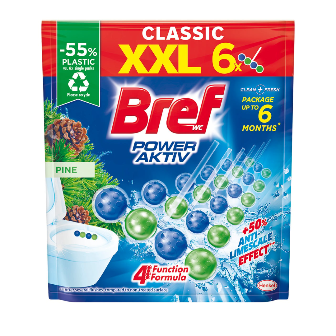 Bref Power Aktiv Automatic Toilet Cleaner Rim Block and Freshener - Pine Scented +50% Anti-limescale Looking for an easier way to keep your toilet clean and fresh? The Bref Power Activ toilet rim block is a simple and convenient cleaner that will keep your toilet clean and fresh. Bref Power Aktiv´s +50% anti-limescale effect consists of a 4-function formula: 1) Cleaning foam: refreshes the toilet with every flush 2) Anti-limescale: prevents limescale from forming in the toilet 3) Dirt protection: prevents dirt from sticking 4) Extra freshness: leaves a long-lasting fresh scent in the toilet Bref Power Aktiv now has +50% anti-limescale effect, ensuring a cleaner and brighter toilet. Simply hang the toilet rim block on the toilet rim and adjust it to the water flow. Experience cleanliness when flushing the toilet and the freshness of the pine scent of the toilet. The carton and basket are 100% recyclable. To recycle the toilet cleaner carton, separate it from the blister pack.
