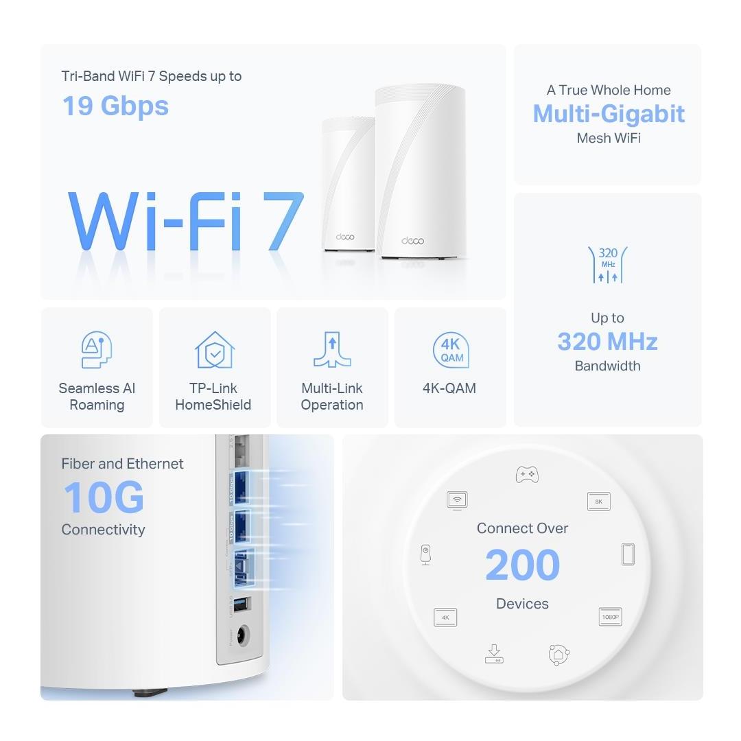 Deco BE85 V1|Wireless Router|Available bandwidth 19000 Mbps|Mesh|Wi-Fi 7|2x2.5GbE|1x10GbE|1xSPF+|WPA - Wi-Fi Protected Access|WPA2 - Wi-Fi Protected Access|WPA3|DHCP|Wireless Frequency Range 2.4 GHz - 6 GHz|Included Accessories Deco BE85 (2-pack)2 Deco BE85 units1 RJ45 Ethernet cable2 Power adaptersQuick Installation Guide|Colour White|Dimensions 128 × 128 × 236 mm