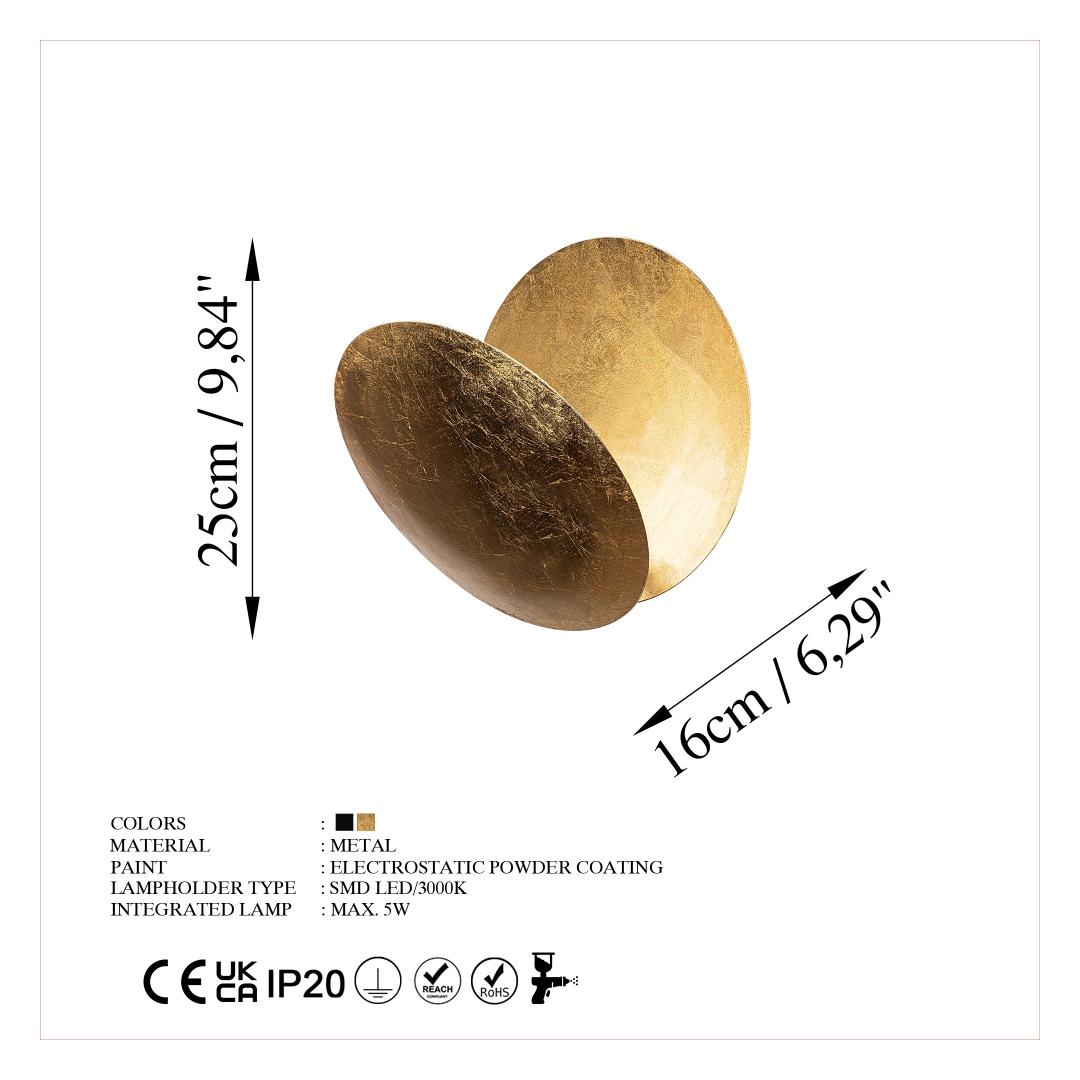 Valaise tilasi tyylikkäästi ja tyylikkäästi Esittelemällä hienovarainen seinävalaisimemme, joka on suunniteltu lisäämään eleganttia tunnelmaa mihin tahansa huoneeseen. Metallirungosta valmistettu valaisin on kestävä ja tyylikäs, joten se on täydellinen lisä kodin sisustukseen. Vapauta metallin voima Metallinen pohjalevy takaa vakauden ja pitkäikäisyyden, mikä takaa, että tämä valaisin on arvostettu osa huonettasi tulevina vuosina. Leveys, korkeus ja syvyys ovat 25 cm, joten se on täydellisen kokoinen, jotta se tekee vaikutuksen ilman, että se hukuttaa tilasi.Upea muotoiluKorkki on halkaisijaltaan 25 cm ja korkeudeltaan 2 cm, ja sen muotoilu on elegantti ja moderni, kun taas pohjalevy, jonka halkaisija on 10 cm ja korkeus 2 cm, tuo valaisimeen ainutlaatuisuutta. Tämän valaisimen valloittava kultainen väri täydentää vaivattomasti mitä tahansa sisustusta ja luo lämpimän ja kutsuvan tunnelman. Koe led-valaistuksen loistokkuusTämässä seinävalaisimessa on smd-led-lamppupesä ja 5 watin led-pistorasia, ja se tarjoaa energiatehokkaan valaistuksen, joka valaisee tilasi pehmeällä ja rauhoittavalla hehkulla. Led-tekniikka takaa pitkäikäisyyden ja pienentää hiilijalanjälkeäsi, mikä tekee siitä ympäristöystävällisen valinnan. Tekniset tiedot:Metallirunko takaa kestävyyden ja tyylikkyydenMetallijalusta takaa vakaudenLeveys: 25 cm, Korkeus: 25 cm, Syvyys: 16 cm.Korkin halkaisija: 25 cm, Korkin korkeus: 2 cmJalkalevyn halkaisija: 10 cm, Jalkalevyn korkeus: 2 cmIP 20 -luokitus turvalliseen sisäkäyttöönLampun pistorasiatyyppi: SMD LEDPistorasiatyyppi: LED 5Kultainen väri(t) kiehtovaa ilmettä vartenVahvista asuintilaasi tällä upealla seinävalaisimella ja muuta huoneesi kauneuden ja tyyneyden paratiisiksi. Tilaa nyt ja anna tämän valaisimen eleganssin valaista kotisi. Väri: Kulta