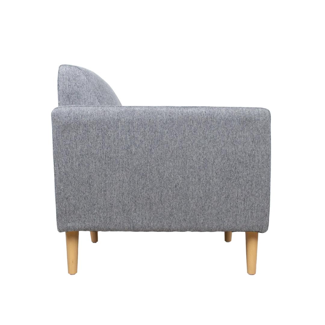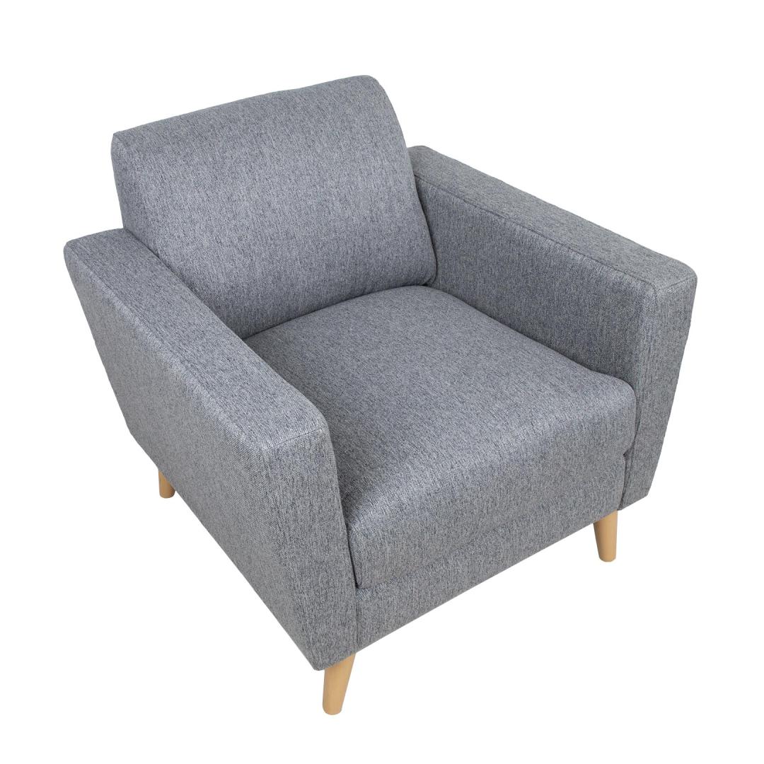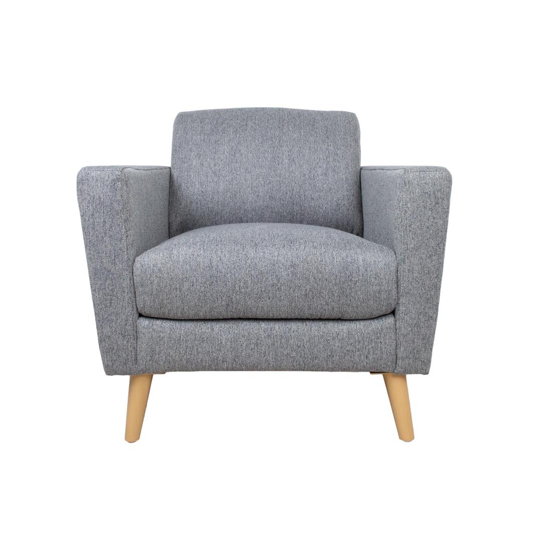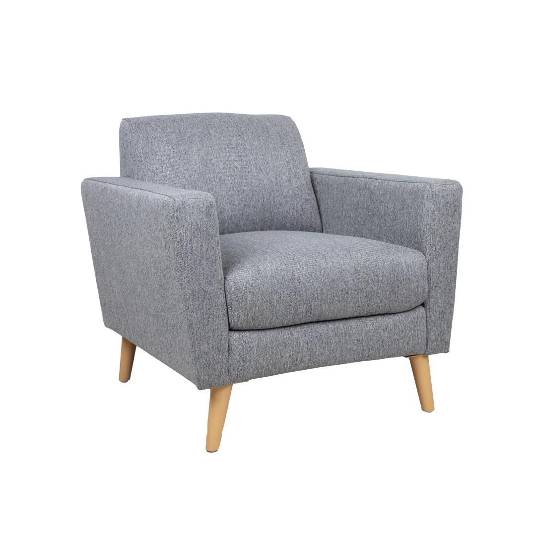 Armchair KAILI grey. The frame of the armchair is made of wood and plywood. Pocket spring block inside the seat ensures excellent sitting comfort. Polyurethane foam (PU 25kg/m³) and bulky polyester fiber are used for padding. The armchair is completely covered with polyester fabric. The overall dimensions of the armchair are 84x83xH84cm. Seat width 56cm, seat depth 56cm, seat height 49cm. The height of the armrest from the ground is 64cm, the width of the armrest is 13cm. The armchair has light wooden legs H19cm. Tugitool KAILI hall.