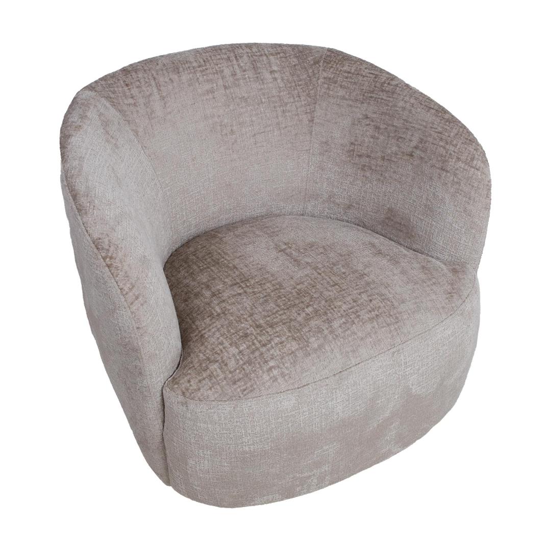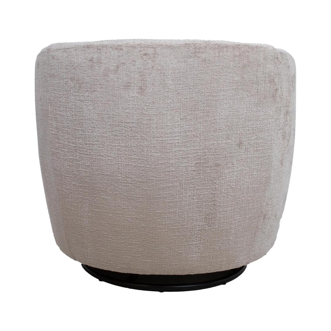 Armchair MANUELA beige. The round-shaped 360° swivel armchair is comfortable and functional, fitting perfectly in both home and office settings. The seat frame is made of wood and plywood. Inside the seat is a pocket spring block. The padding consists of polyurethane foam and polyester fiber. The covering material is polyester fabric with a Martindale value of 41 000. The overall dimensions of the chair are 84x82xH75cm. Seat width is 51cm, seat depth is 56cm, and seat height is 45cm. Tugitool MANUELA beež.