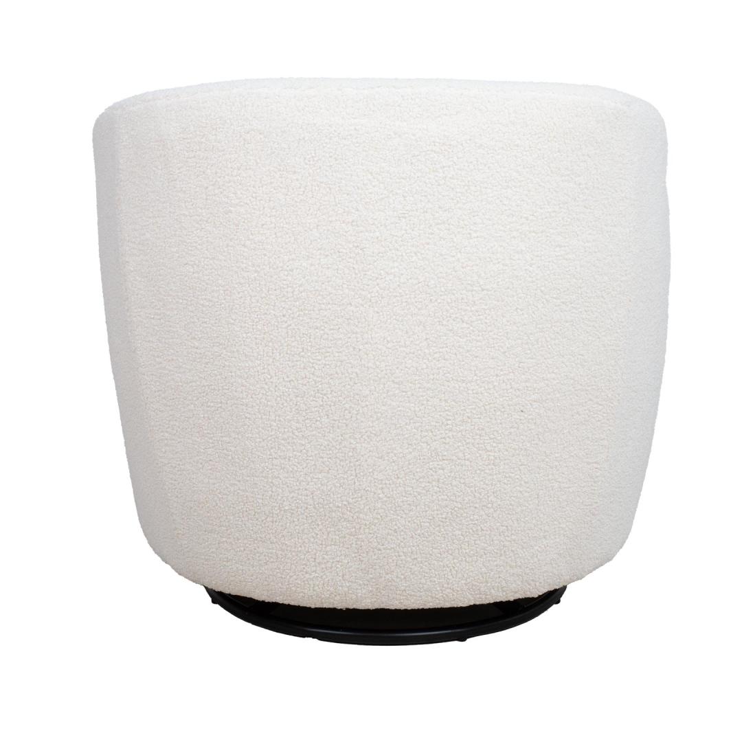 Armchair MANUELA white. The round-shaped 360° swivel armchair is comfortable and functional, fitting perfectly in both home and office settings. The seat frame is made of wood and plywood. Inside the seat is a pocket spring block. The padding consists of polyurethane foam and polyester fiber. The chair is covered with furry polyester fabric. The overall dimensions of the chair are 84x82xH75cm. Seat width is 51cm, seat depth is 56cm, and seat height is 45cm. Tugitool MANUELA valge. Ümara vormiga 360° pöörlev tugitool on mugav ja funktsionaalne ning sobitub suurepäraselt nii koju kui kontorisse. Istme karkass on valmistatud puidust ja vineerist. Istme sees on pocket vedruplokk. Polsterduseks on kasutatud polüuretaanvahtu ja polüesterkiudu. Tool on kaetud karvase polüesterkangaga. Tooli üldmõõdud on 84x82xH75cm. Istme laius 51cm, istme sügavus 56cm, istme kõrgus 45cm.