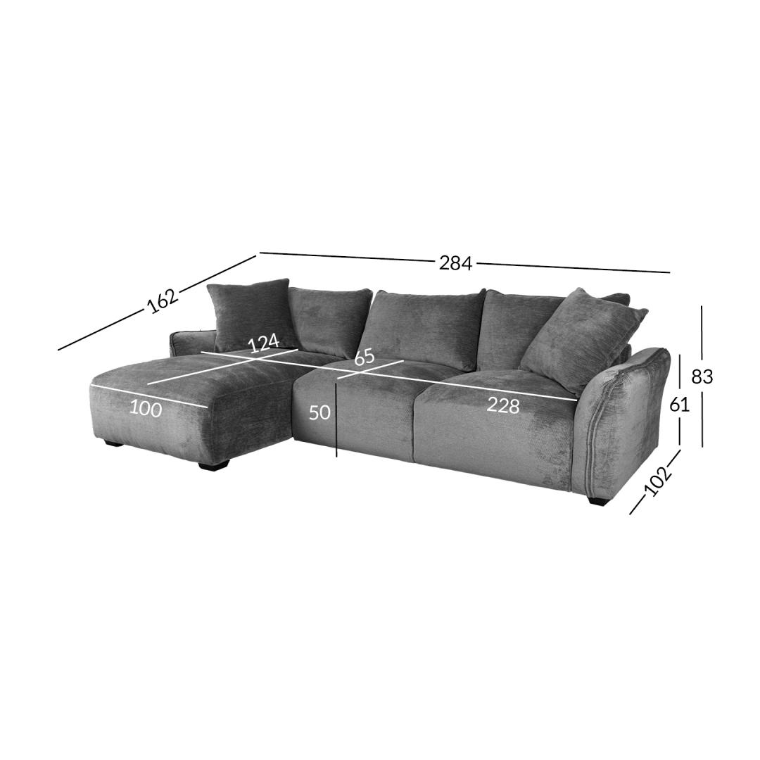 Diivani üldmõõdud on 284x162/102xH83cm. Istme laius 154+74cm, istme sügavus 65/124cm. Istme kõrgus 50cm. Käetoe kõrgus maast 61cm.