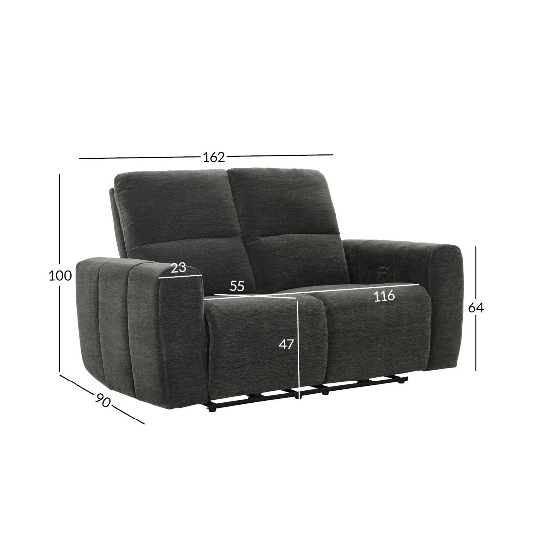 Diivani üldmõõdud on 162x90xH100cm. Istme laius 116cm, istme sügavus 55cm, istme kõrgus 47cm. Käetoe kõrgus maast 64cm, käetoe laius 23cm. Diivan MATIAS 2-kohaline elektriline recliner, hall.