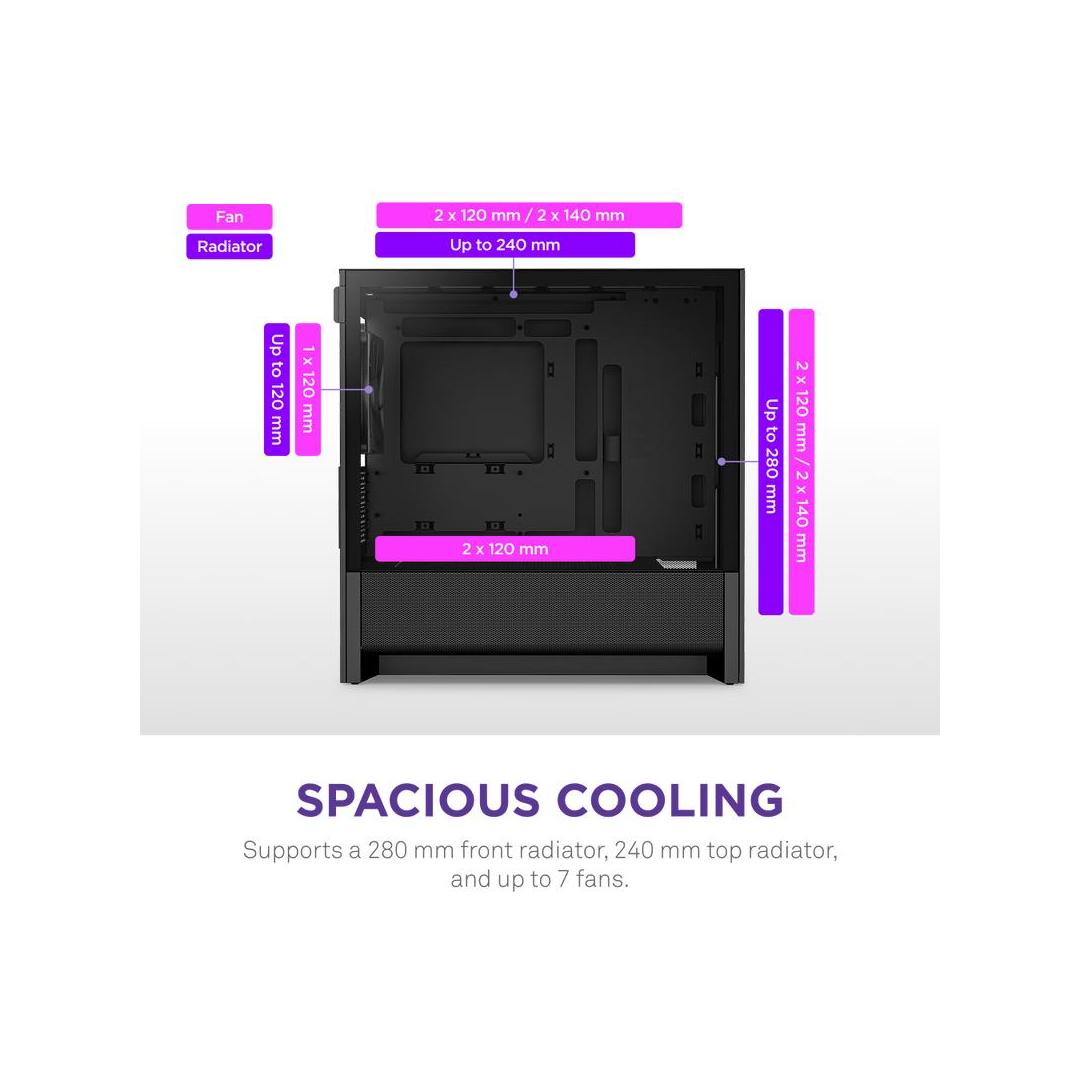 • Extensive Cooling Support: Supports up to a 280 mm radiator in the front, a 240 mm radiator on top, and up to seven fans for powerful, customizable cooling performance.