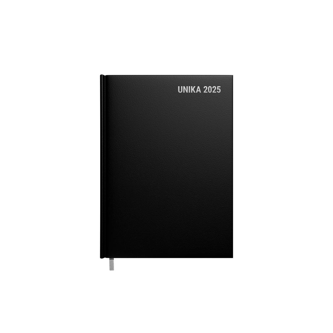Cover size: 170 x 221 mm Content size: 148 x 210 mm (A5) Covers made of artificial leather, with sewn edges, inner pockets on the cover Spiral-bound content block Rubber strap Language: Estonian, English, Latvian, Lithuanian, Russian All UNIKA calendars include the following: Public holidays, national anniversaries, summer - and transition to winter time, moon phases, zodiac signs, day list, mini-calendar, week number, times of the day. Annual plan (3 months per page), holiday planner, name days of 3 countries in table on additional pages.