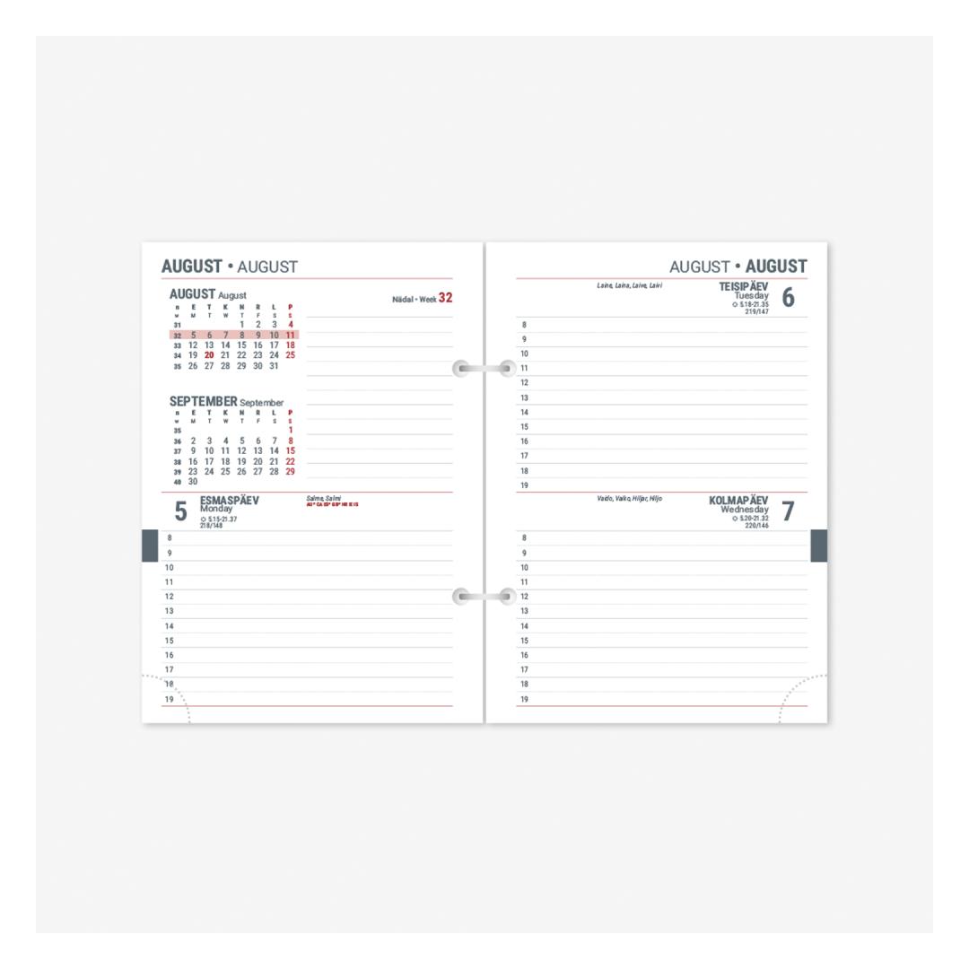 Content size: 105 x 148 mm (A6) Language: Estonian and English Perforated open pages (2 holes) Perforated page corners Suitable for the following covers: ESTO-NÚNIK Leather ESTO-NÚNIK Artificial leather