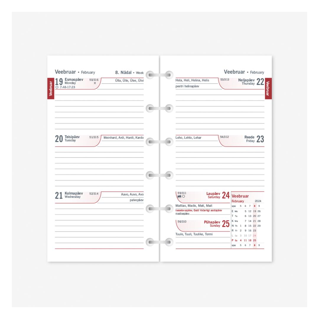 Content size: 73 x 135 mm Language: Estonian and English Perforated open pages (6 holes) Suitable for the following covers: MINI Timex
