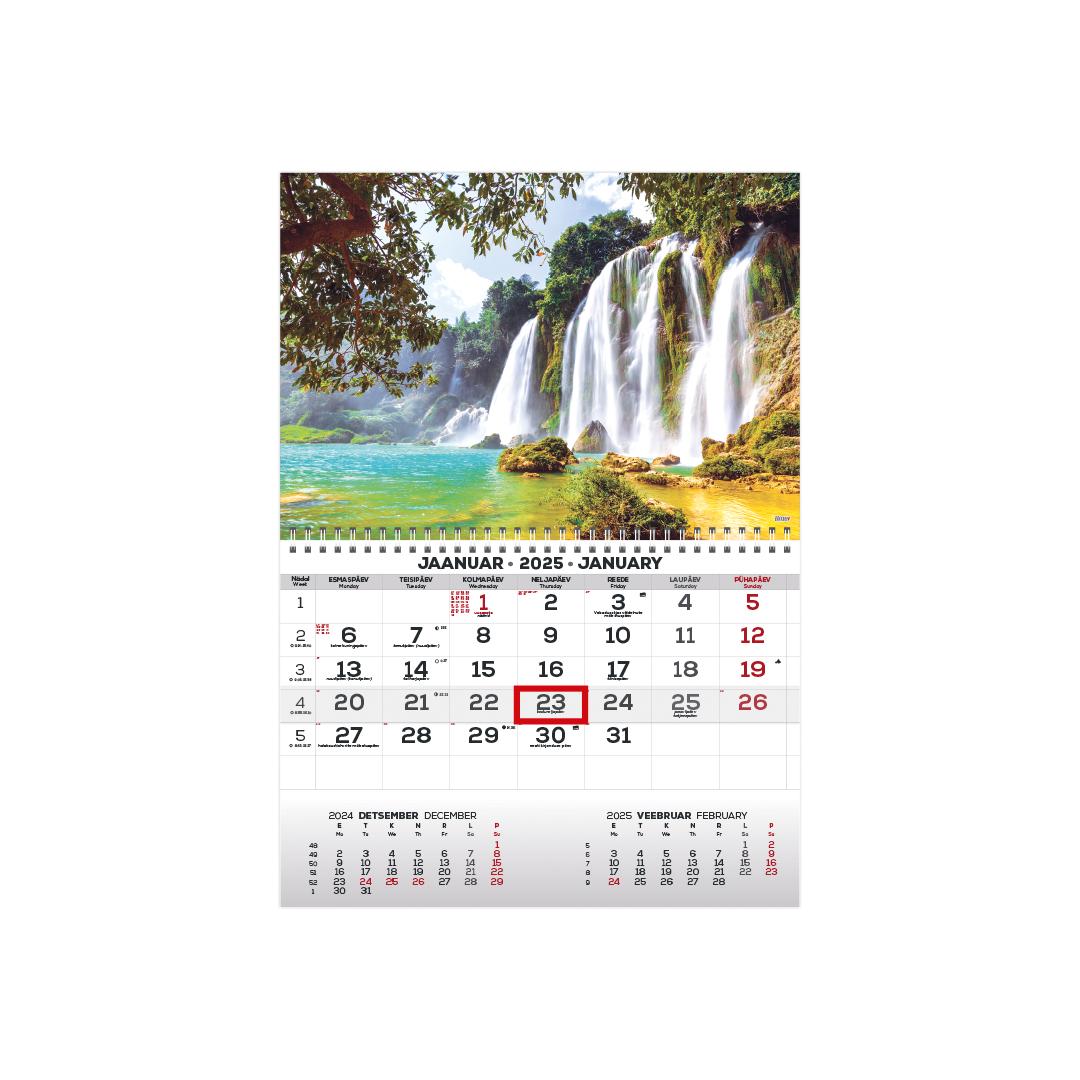 Size: 297 x 420 mm Spiral binding Hanging hole Content volume 12 pages Date marker Content dark gray / red Language: Estonian and English The calendar includes the following: National holidays, national and national calendar holidays, flag days, national holidays of 37 countries with abbreviations, summer and winter time transition, sunrise and sunset times (Tallinn), phases of the moon with times, zodiac signs, beginnings of seasons with times, previous and following month, week number.