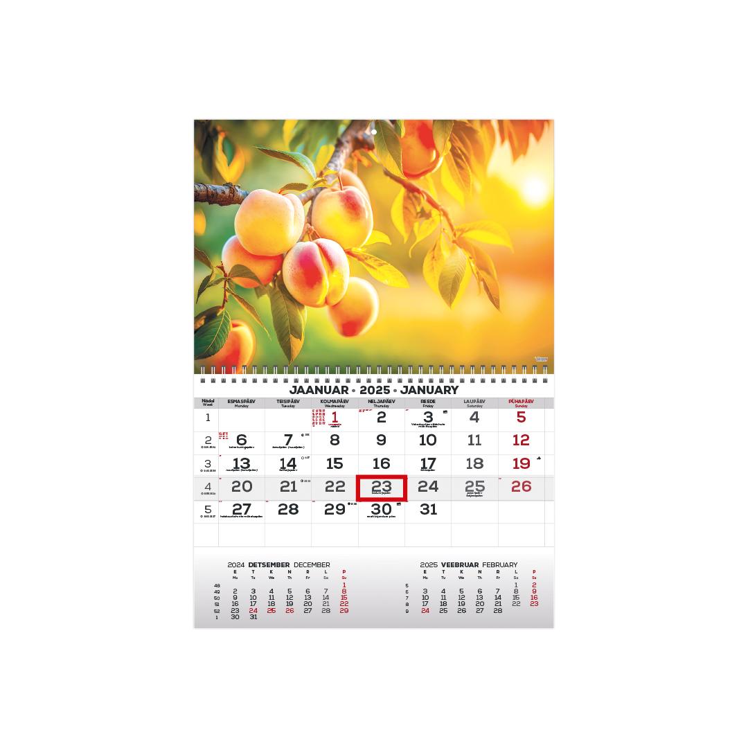 Size: 297 x 420 mm Spiral binding Hanging hole Content volume 12 pages Date marker Content dark gray / red Language: Estonian and English The calendar includes the following: National holidays, national and national calendar holidays, flag days, national holidays of 37 countries with abbreviations, summer and winter time transition, sunrise and sunset times (Tallinn), phases of the moon with times, zodiac signs, beginnings of seasons with times, previous and following month, week number.