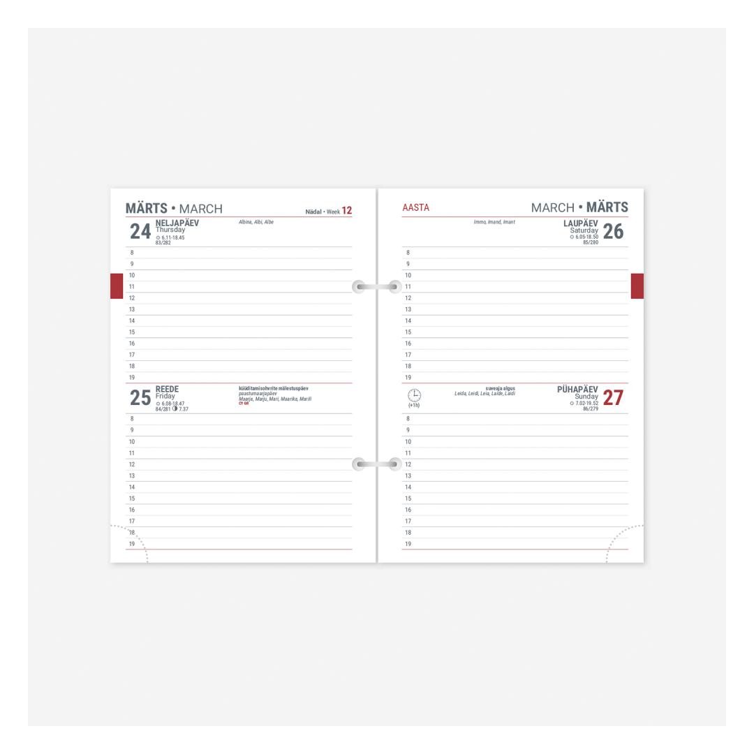 Content size: 105 x 148 mm (A6) Hole spacing: 70 mm Perforated page corners Language: Estonian and English All DESKTOP calendars include the following: Public holidays, national anniversaries, flag and name days, missing Thursdays, summer and winter time transition, national holidays of 37 countries with abbreviations, sunrise and sunset times (Tallinn), moon phases with times, zodiac signs, day list, mini calendar, week number, beginning of seasons with times. Additional pages include tabular calendar, annual plan, holiday planner, contacts, notes, world times, unit conversion, calendar legend.