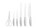 • Includes 20 cm Chef Knife, 20 cm Slicing Knife, 20 cm Bread Knife, 13 cm Utility Knife, 9 cm Paring Knife, Scissors, on-trend charcoal wood block with integrated sharpener & Quick Start Guide