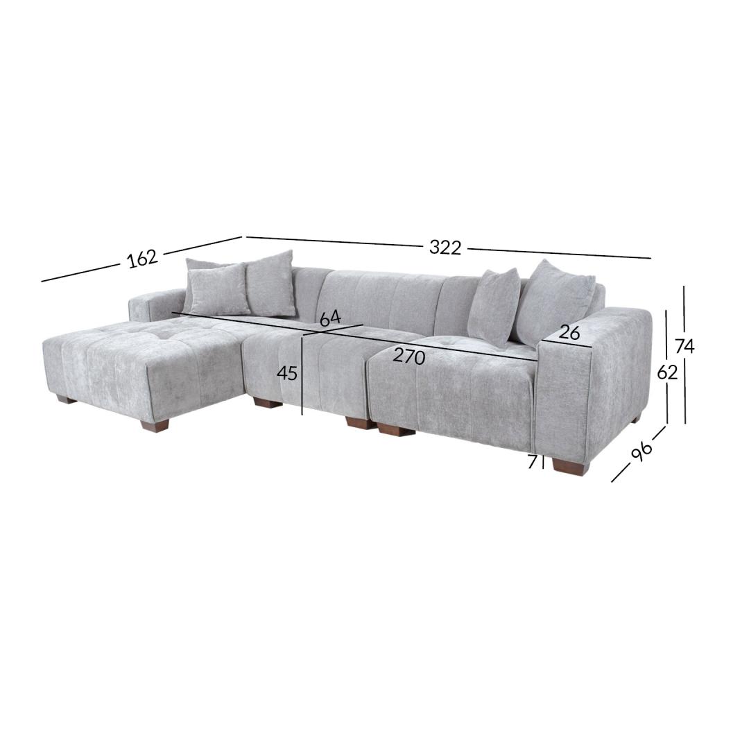 Kulmasohva DAHLIA vasen kulma, vaaleanharmaa. Trendikäs kulmasohva minimalistisella tyylillä, joka sopii moderniin sisustukseen. Runko on valmistettu männystä. Verhoilu on valmistettu korkealaatuisesta polyuretaanivaahdosta. Istuinpohja saa tarvittavan tuen ja kimmoisuuden laadukkaista teräksisistä siksak-jousista. Sohva on kokonaan verhoiltu samettisen pehmeällä kankaalla. Päällystemateriaali: 79 % polyesteriä, 21 % viskoosia. Sohvan kokonaismitat ovat 322x162/96xH74cm. Istuimen leveys 270cm, istuimen syvyys 64cm, istuimen korkeus 45cm. Käsinojan korkeus maasta 62cm, käsinojan leveys 26cm. Sohvassa on tummat puujalat H7cm. Settiin kuuluu 3+2 sohvatyynyä, joiden mitat ovat 55x55cm ja 42x42cm. Kulmasohva DAHLIA vasen kulma, vaaleanharmaa. Trendikäs kulmasohva minimalistisella tyylillä, joka sopii moderniin sisustukseen. Runko on valmistettu männystä. Verhoilu on valmistettu korkealaatuisesta polyuretaanivaahdosta. Istuinpohja saa tarvittavan tuen ja kimmoisuuden laadukkaista teräksisistä siksak-jousista. Sohva on kokonaan verhoiltu samettisen pehmeällä kankaalla. Päällystemateriaali: 79 % polyesteriä, 21 % viskoosia. Sohvan kokonaismitat ovat 322x162/96xH74cm. Istuimen leveys 270cm, istuimen syvyys 64cm, istuimen korkeus 45cm. Käsinojan korkeus maasta 62cm, käsinojan leveys 26cm. Sohvassa on tummat puujalat H7cm. Settiin kuuluu 3+2 sohvatyynyä, joiden mitat ovat 55x55cm ja 42x42cm.