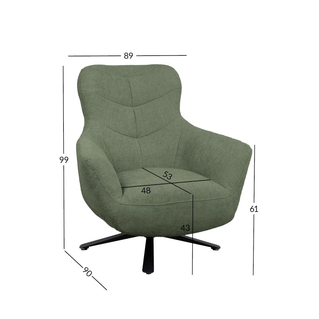 Nojatuoli HELGA vihreä. Tyylikäs nojatuoli pehmeillä linjoilla on kutsuva ja voittaa nopeasti sydämet erinomaisen mukavuutensa ansiosta. Hyvin harkittu muotoilu ja huolellisesti valitut laatumateriaalit takaavat ajattoman ja kestävän lopputuloksen, joka sopii täydellisesti erilaisiin tyyleihin ja huonetyyleihin. Tuoli kääntyy 360°, mikä mahdollistaa mukavan pääsyn ja näkymän kaikkeen ympärillä olevaan ilman seisomista. Tuolin runko on valmistettu metallista. Istuimen sisällä on jousipalikka. Verhoilu on valmistettu korkealaatuisesta polyuretaanivaahdosta, jonka tiheys on 18/24/26 kg/m³. Nojatuoli on verhoiltu pehmeällä polyesterikankaalla. Tukeva teräksinen 4-vartinen jalkatuki on viimeistelty mustalla pulverimaalilla. Tuolin kokonaismitat ovat 89x90xK99cm. Istuimen leveys 48cm, istuimen syvyys 53cm, istuimen korkeus 43cm. Käsinojan korkeus maasta 61cm. Painoraja 200kg. Nojatuoli HELGA vihreä. Tyylikäs nojatuoli pehmeillä linjoilla on kutsuva ja voittaa nopeasti sydämet erinomaisen mukavuutensa ansiosta. Hyvin harkittu muotoilu ja huolellisesti valitut laatumateriaalit takaavat ajattoman ja kestävän lopputuloksen, joka sopii täydellisesti erilaisiin tyyleihin ja huonetyyleihin. Tuoli kääntyy 360°, mikä mahdollistaa mukavan pääsyn ja näkymän kaikkeen ympärillä olevaan ilman seisomista. Tuolin runko on valmistettu metallista. Istuimen sisällä on jousipalikka. Verhoilu on valmistettu korkealaatuisesta polyuretaanivaahdosta, jonka tiheys on 18/24/26 kg/m³. Nojatuoli on verhoiltu pehmeällä polyesterikankaalla. Tukeva teräksinen 4-vartinen jalkatuki on viimeistelty mustalla pulverimaalilla. Tuolin kokonaismitat ovat 89x90xK99cm. Istuimen leveys 48cm, istuimen syvyys 53cm, istuimen korkeus 43cm. Käsinojan korkeus maasta 61cm. Painoraja 200kg.