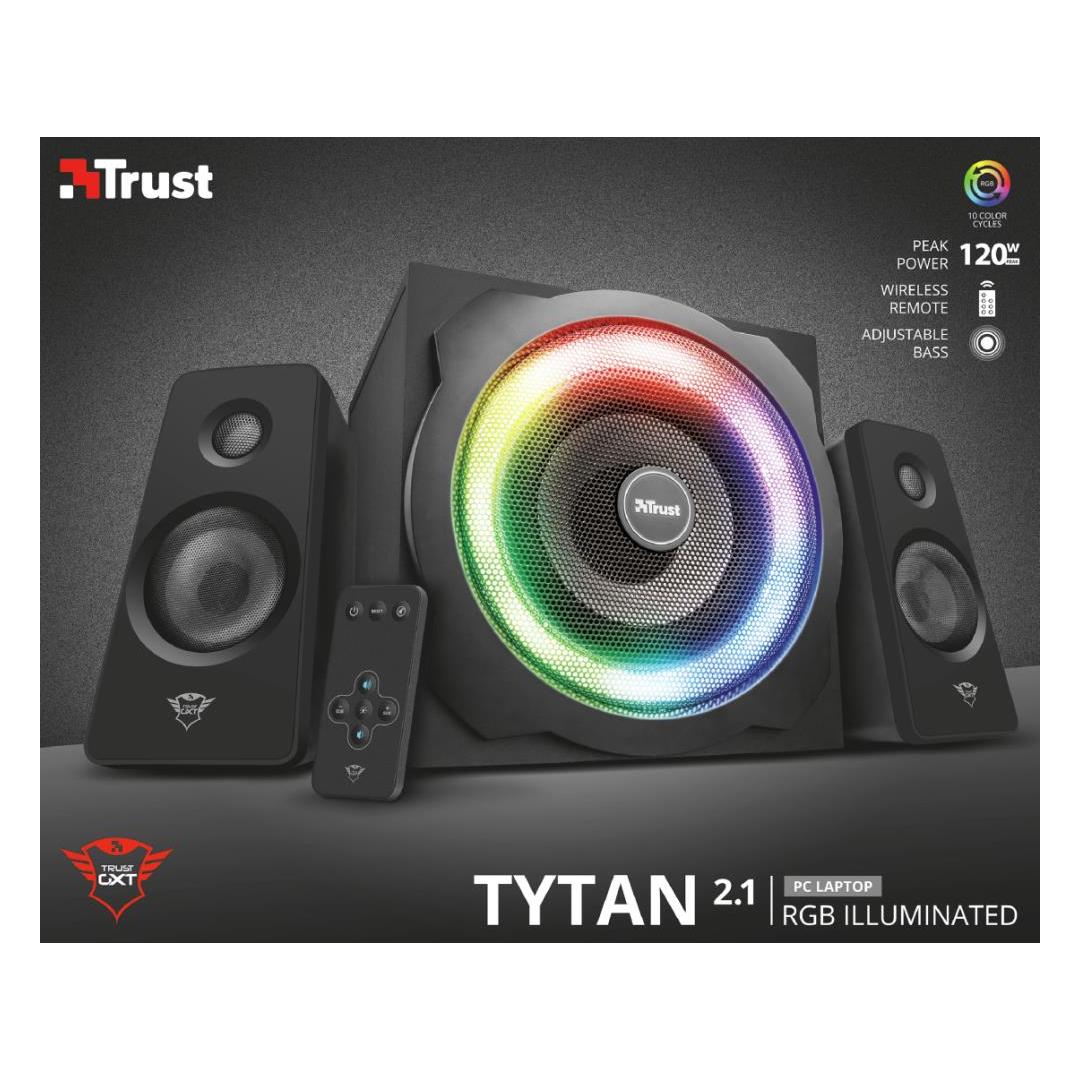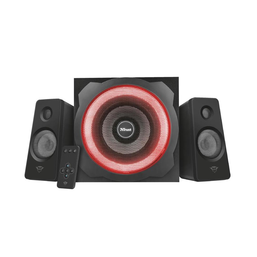 Tehokas 2.1-kaiutinsarja 120 W huipputeholla (60 W RMS) Yhteensopiva PC:n/kannettavan tietokoneen, älypuhelimen/tabletin, Wii:n, Sony PlayStation 3:n ja Xbox 360:n kanssa Puinen subwoofer antaa täyteläisen ja voimakkaan äänen Esiasetetut valotilat: 7 kiinteää bassosynkronoitua väriä, hengittävä RGB, pyörivä RGB ja bassosynkronoitu RGB Sisältää langattoman kaukosäätimen, jolla voi ohjata virtaa, äänenvoimakkuutta, bassoa ja valoa Älykäs virranhallinta: siirtyy valmiustilaan, kun sitä ei käytetä