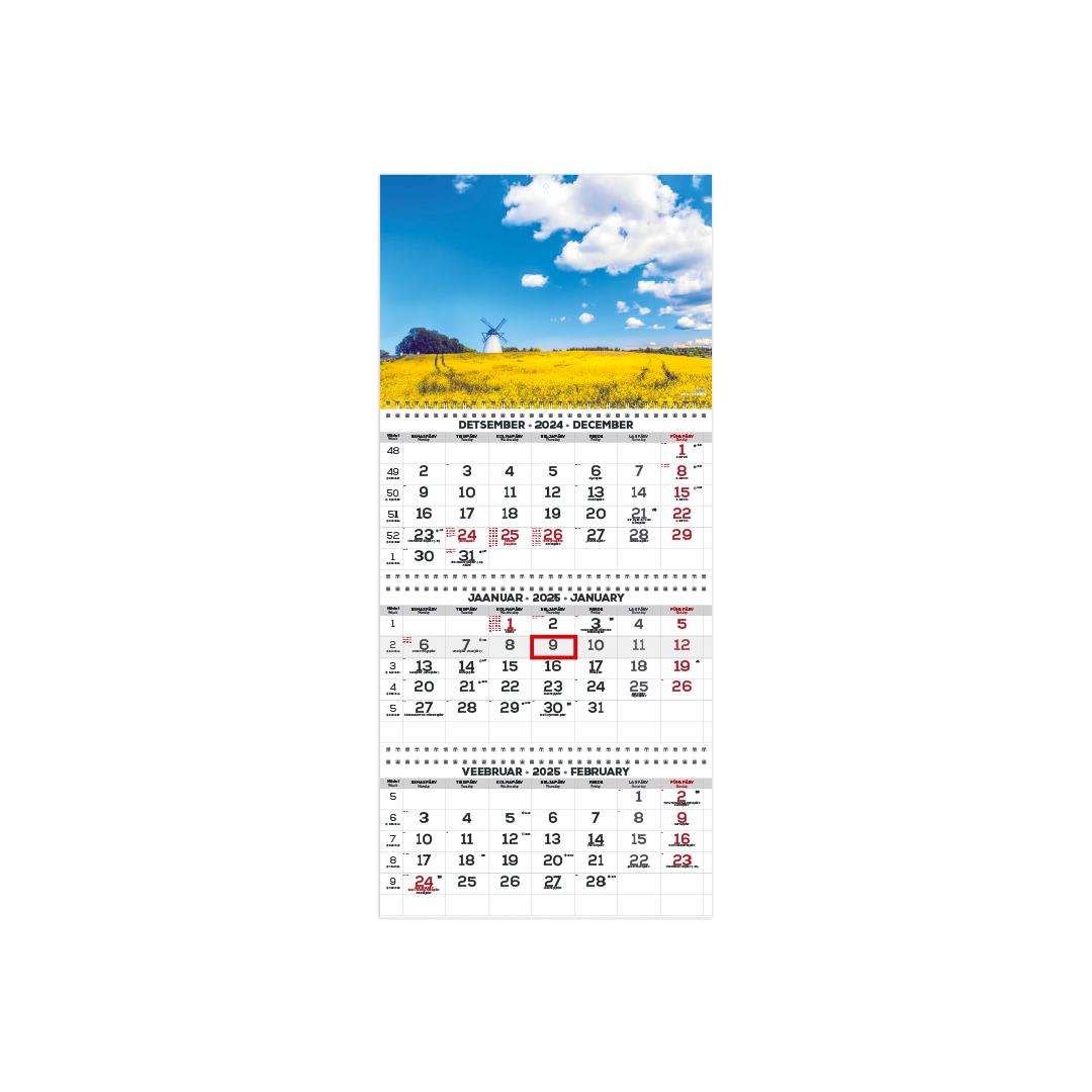 Koko: 297 x 650 mm Kolmiosainen kierresidonta Ripustusreikä Kapasiteetti 3 x 12 sivua Päivämäärämerkintä Sisältö tummanharmaa / punainen Kieli: englanti ja viro Kalenteri sisältää: Juhlapyhät, kansalliset ja kansalliset kalenterimerkinnät, liputuspäivät, 37 maan juhlapyhät lyhenteineen, kesä- ja talviaikaan siirtyminen, auringonnousu- ja -laskuajat (Tallinna), kuukauden vaiheet kellonaikoineen, horoskooppimerkit, vuodenaikojen alkamisajat kellonaikoineen, edeltävä ja seuraava kuukausi, viikkonumero.