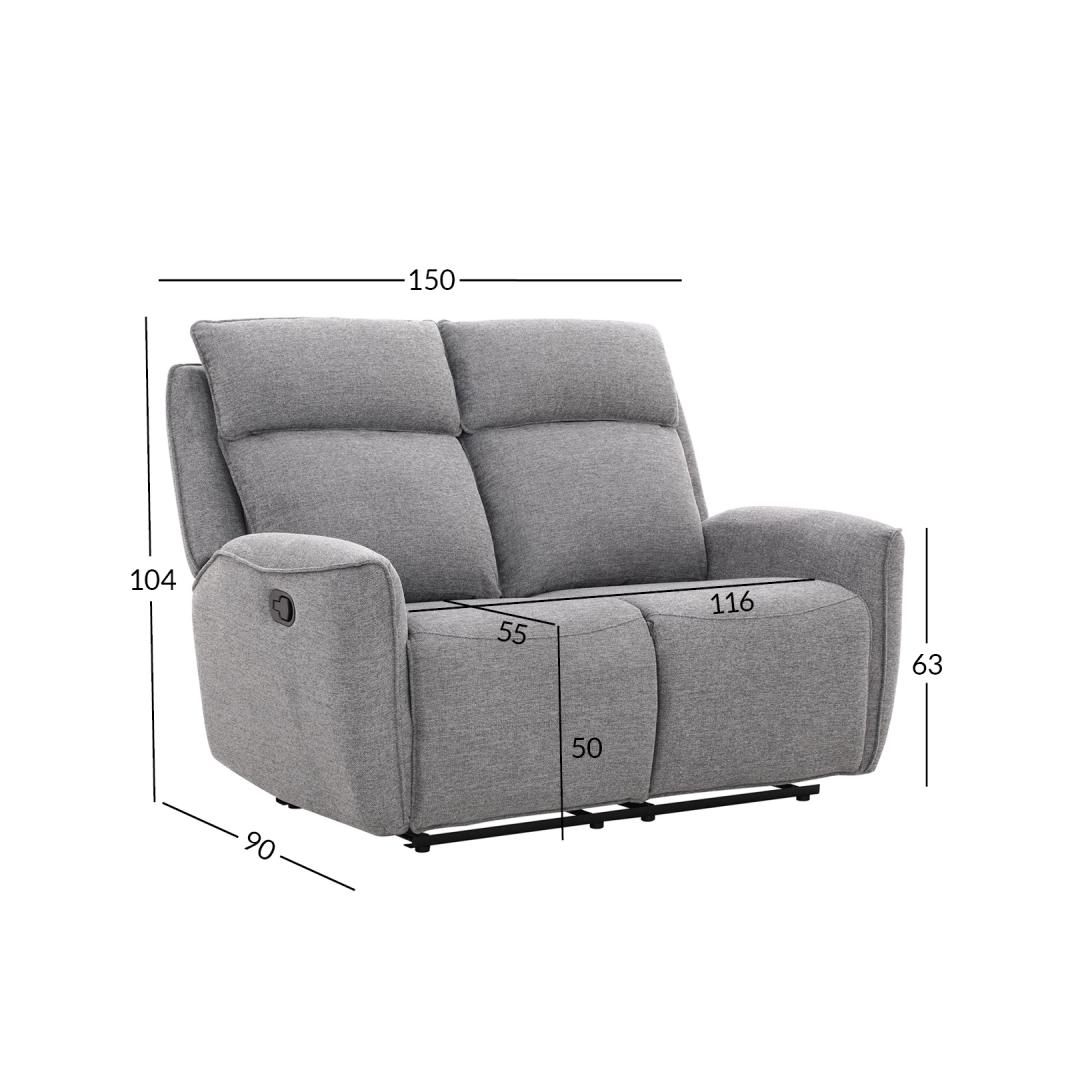 Sohvan kokonaismitat ovat 150x90xK104cm. Istuimen leveys 116cm, istuimen syvyys 55cm, istuimen korkeus 50cm. Käsinojan korkeus maasta 63cm. Sohva MAREN 2-paikkainen manuaalinen lepotuoli, harmaa.