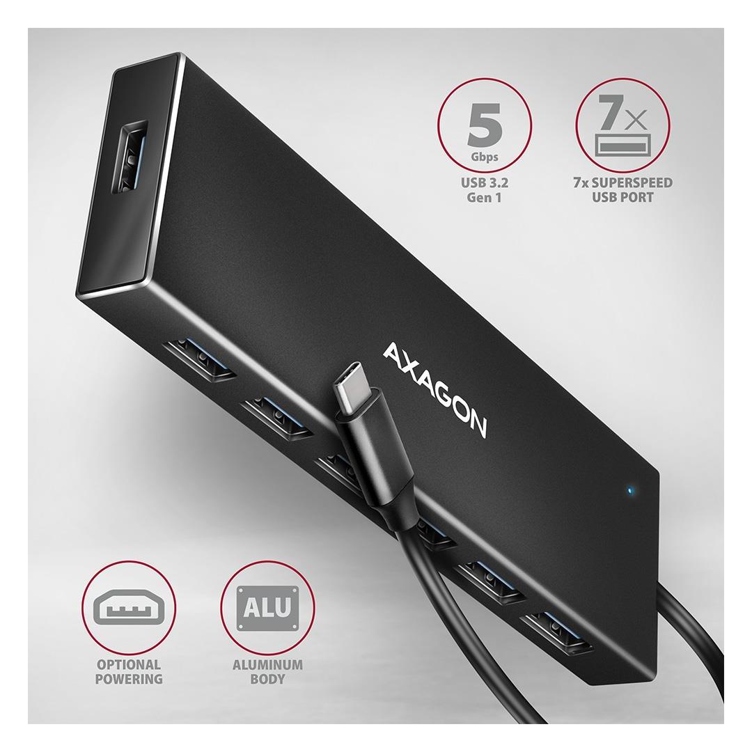 Ohut USB-C 3.2 Gen 1 (USB 3.0) -keskitin AXAGON HUE-F7C, jossa on 30 cm pitkä USB-kaapeli, yhdistää nopeasti ja helposti jopa seitsemän USB-laitetta kannettavaan tietokoneeseen samanaikaisesti. USB 3.2 Gen 1 -standardi mahdollistaa jopa 5 Gb/s siirtonopeuden.